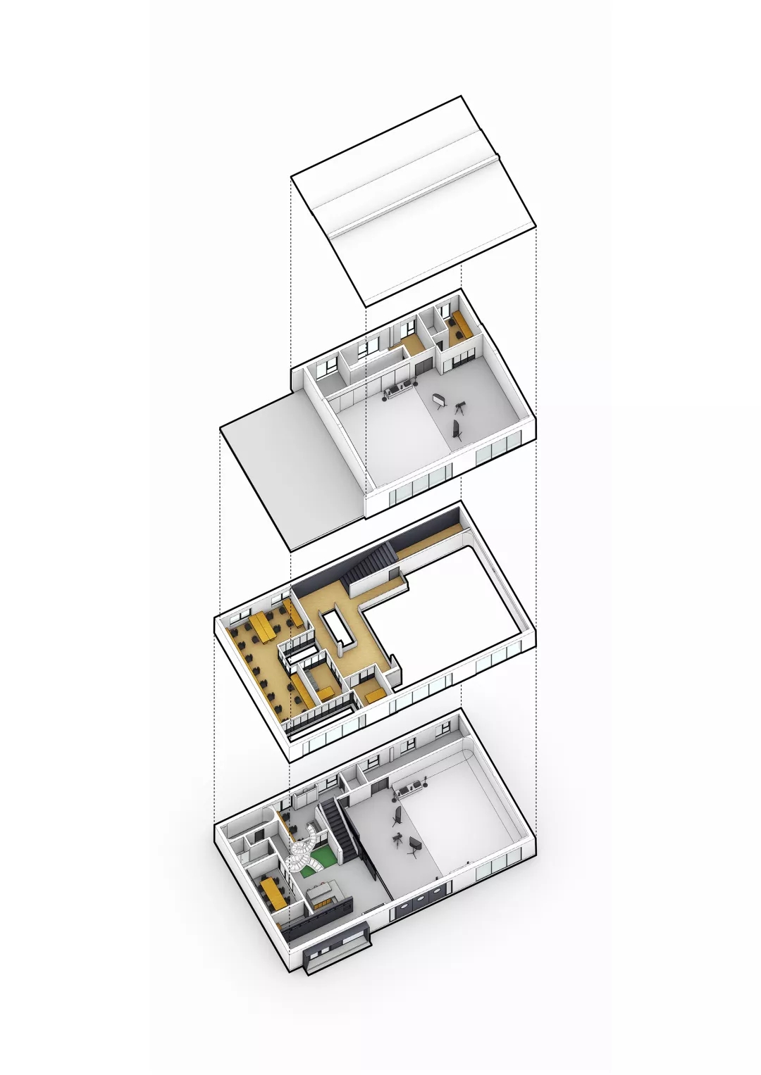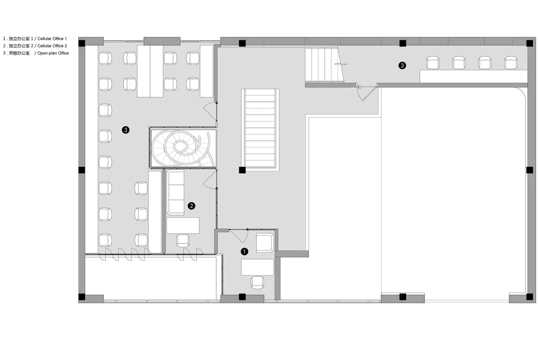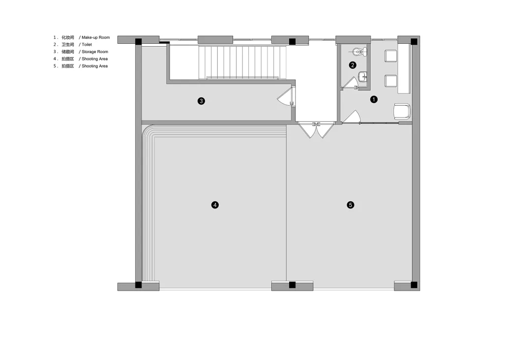 ASTUDIO攝影工作室是一個(gè)多功能的復(fù)合空間,UUA把拍攝、化妝、接待、辦公、會(huì)議、休閑等多種功能有機(jī)地融合在這個(gè)通高的廠房之中,空間緊湊又富于變化。拍攝區(qū)為最重要的功能單元,由于需要足夠的長寬高空間來滿足設(shè)置無影墻、布景布光以及拍攝距離等需求,所以設(shè)計(jì)師將一層的一半劃歸為1號(hào)拍攝區(qū),保留雙層通高的空間形式;另一半則加建出雙層空間,其中一層作為接待,二層作為辦公。廠房的三層因?yàn)樵揪哂凶銐虻膶痈?,因此被設(shè)置為2號(hào)拍攝區(qū)。