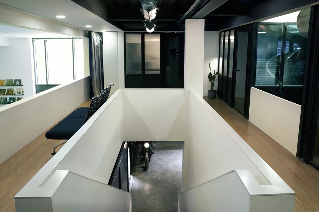 ASTUDIO攝影工作室位于CBD東側(cè)菁英谷文創(chuàng)園內(nèi),整體的設(shè)計(jì)風(fēng)格融合了粗狂工業(yè)風(fēng)和現(xiàn)代簡約風(fēng)。原有建筑為雙層的廠房空間,這種大空間非常適合拍攝的需求。攝影師希望把這個(gè)大空間改造為兩個(gè)相對(duì)獨(dú)立的拍攝區(qū),并且有各自獨(dú)立的化妝間和出入口,從而可以同時(shí)進(jìn)行兩場(chǎng)獨(dú)立的拍攝。UUA將原有的二層建筑在豎向上改造成為了三層的空間,其中第一層包含接待區(qū)和1號(hào)拍攝區(qū),第二層整體為辦公空間,第三層是2號(hào)拍攝區(qū),這種豎向上的分區(qū)保障了兩場(chǎng)同時(shí)拍攝的獨(dú)立性。