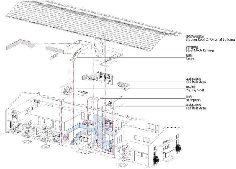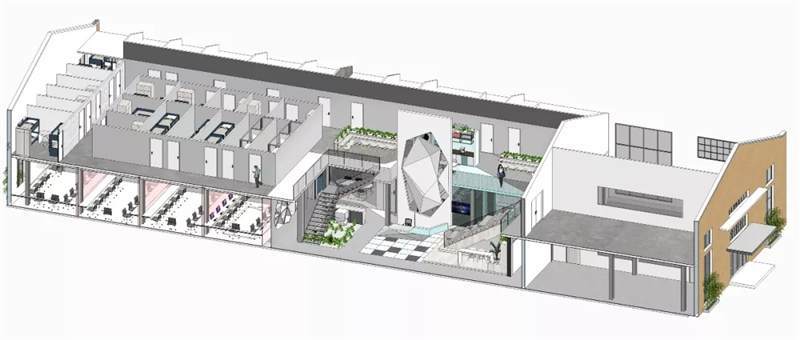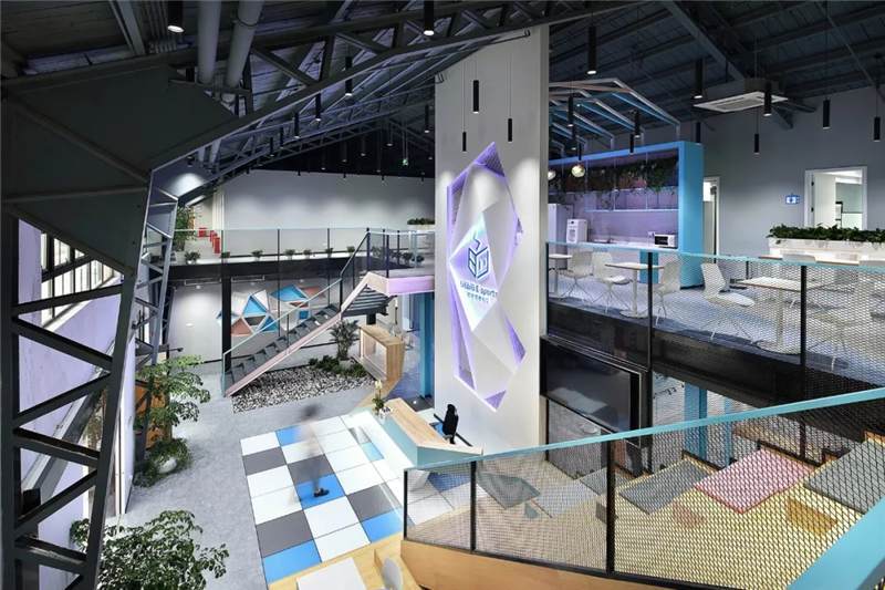 本案位于上海市寶山區(qū)蘊(yùn)川路6號智慧灣科創(chuàng)園,原建筑為3D打印的廠房裝修,室內(nèi)最高凈高9米,最低6.4米。此空間除原建筑結(jié)構(gòu)墻外,無任何結(jié)構(gòu)柱與墻體,因此為了更充分合理的利用空間,設(shè)計(jì)師構(gòu)筑了二層,根據(jù)嗶哩嗶哩電競的辦公功能訴求,布置空間功能區(qū),即1F分布前臺區(qū)、會(huì)議區(qū)、茶水接待區(qū)、賽訓(xùn)室、開敞辦公區(qū)、導(dǎo)播室。2F分布就餐區(qū)、住宿區(qū)、導(dǎo)播室等空間。