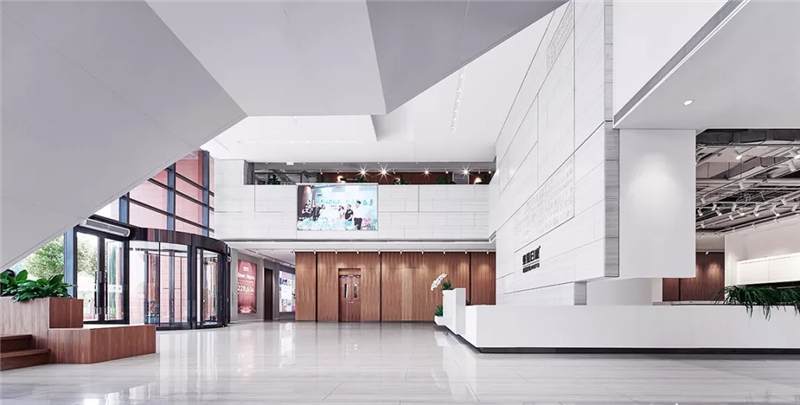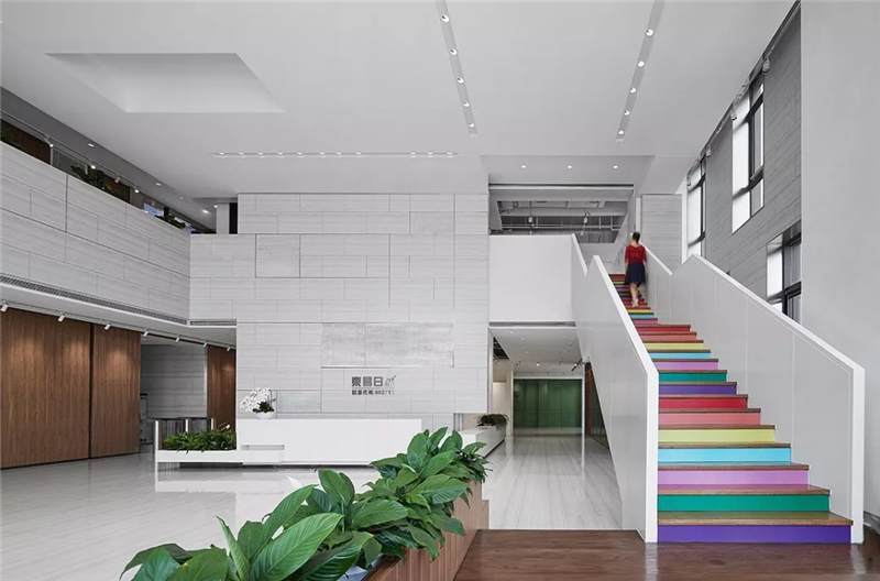 前廳大堂采用高挑空結(jié)構(gòu),用大尺寸純色人造石雕刻工藝打造前臺(tái)及LOGO背景墻,背景墻后設(shè)置墻體與東易日盛高端家裝高科技產(chǎn)品一體化展示區(qū),右側(cè)設(shè)置白色穿孔鋁板樓梯配以彩色階梯直達(dá)二層展廳,樓梯平臺(tái)以木飾面板點(diǎn)綴綠植打造成休憩待客區(qū),整個(gè)大堂接待區(qū)營(yíng)造出現(xiàn)代,開放,包容的氛圍。