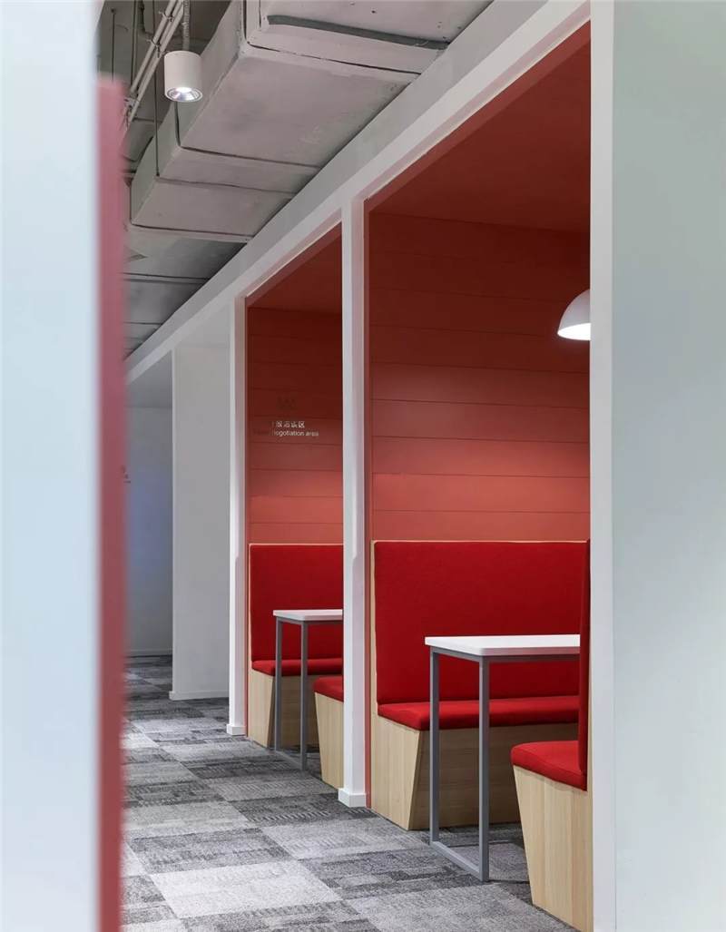 3-6層的各事業(yè)部及旗下子公司辦公層,設(shè)計(jì)師沿著核心筒打造環(huán)形的公共區(qū)域及溝通環(huán)廊帶,依次布置開放休憩洽談區(qū),電話亭,小型會(huì)議室,茶水間,衛(wèi)生間,涂鴉板等促進(jìn)溝通交流但界限模糊的混合功能區(qū),并采用卡座,綠植,通透金屬框架,玻璃配以貼膜,墻貼等方式營(yíng)造公共區(qū)域與辦公區(qū)之間的多層次關(guān)系,形成自由穿梭的辦公空間動(dòng)線。