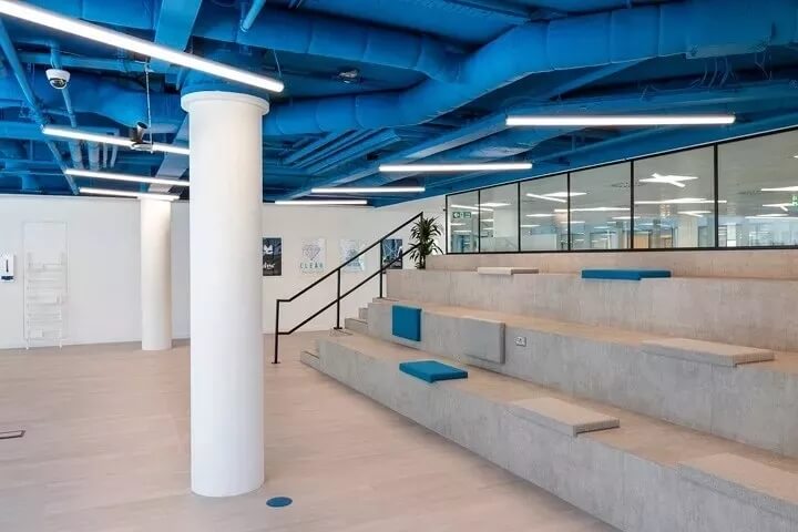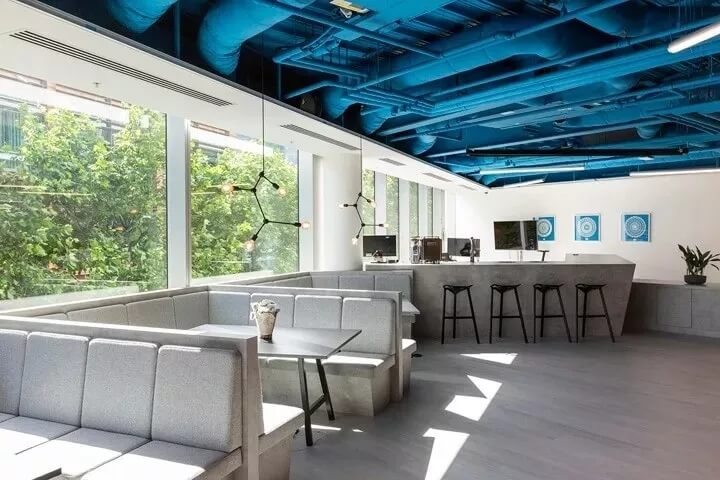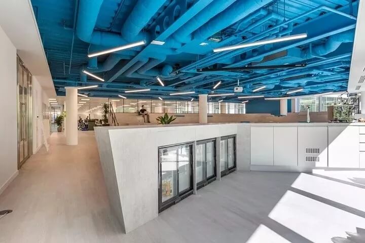 本案最令人贊嘆的創(chuàng)意構(gòu)思是與接待區(qū)相連的休閑區(qū)的藍(lán)色頂面設(shè)計(jì),藍(lán)色是公司的標(biāo)識(shí)色,除了這里也點(diǎn)綴于會(huì)議空間和靈動(dòng)的工作區(qū)。裸露的頂面和設(shè)備管道都統(tǒng)一在純凈的藍(lán)色之中。這里不僅用于接待訪客同時(shí)也是大型集會(huì)、交流協(xié)作和派對(duì)活動(dòng)之地。