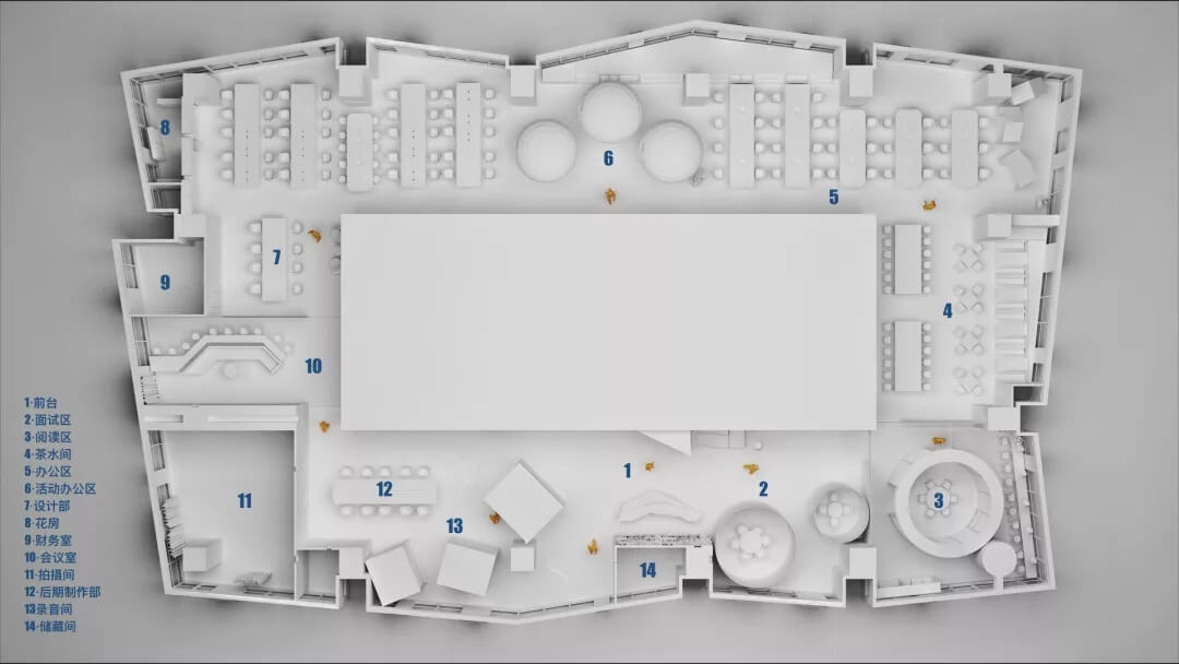 直播間在使用功能上相對獨(dú)立,且私密性較強(qiáng),由三個方形盒子組合而成,并被安置于波浪造型的臺階上,中間穿插熱帶植物進(jìn)行點(diǎn)綴,使使用者仿佛置身于椰林樹影,水清沙白的陽關(guān)海灘。在這里,不僅能夠使工作人員身心放松地完成節(jié)目的錄制工作,同時(shí),空間的層次營造也給予觀賞者強(qiáng)有力的視覺沖擊力,將文化與藝術(shù)的融合達(dá)到了一個新高度。