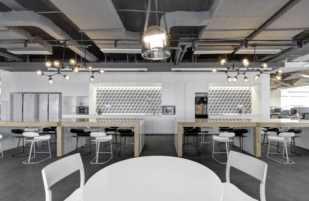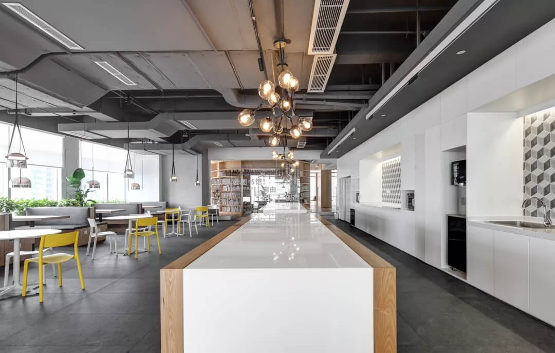 茶水區(qū),同時(shí)也是為員工準(zhǔn)備的小型餐廳,水泥質(zhì)感的休閑餐飲空間更加穩(wěn)重大方,吧臺的設(shè)計(jì)可為員工提供輕食的烹飪,以及簡食的加熱。