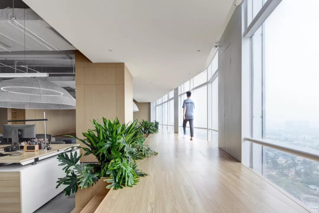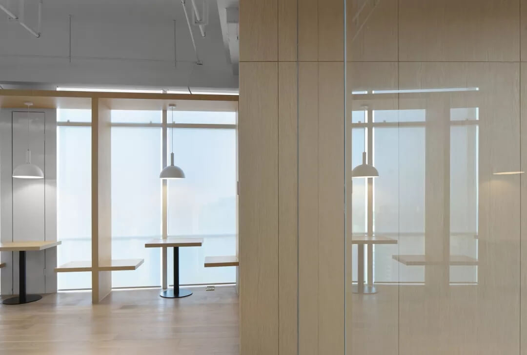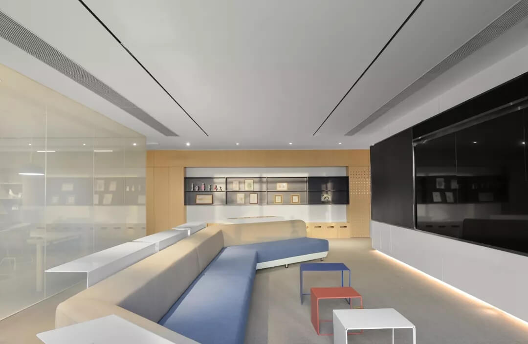 辦公區(qū)的設(shè)計(jì)打破了傳統(tǒng)辦公室嚴(yán)謹(jǐn)有序的陣列式布局方式,而在全景落地窗前設(shè)計(jì)出日式風(fēng)格的“榻榻米”造型,滿足了使用者對于空間多元化的體驗(yàn)要求,同時(shí)分隔空間,局部抬高的空間變得生動且有張力,大大提升了空間的立體感。