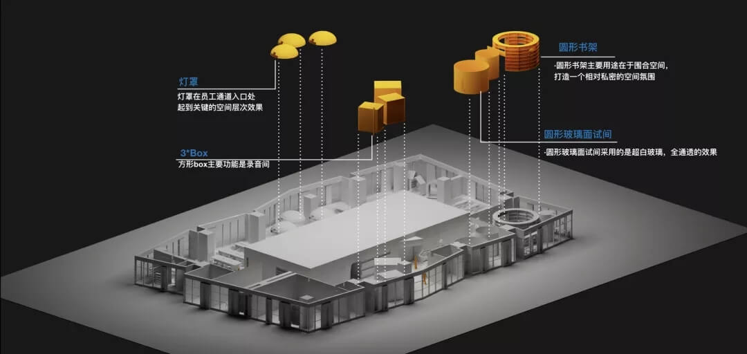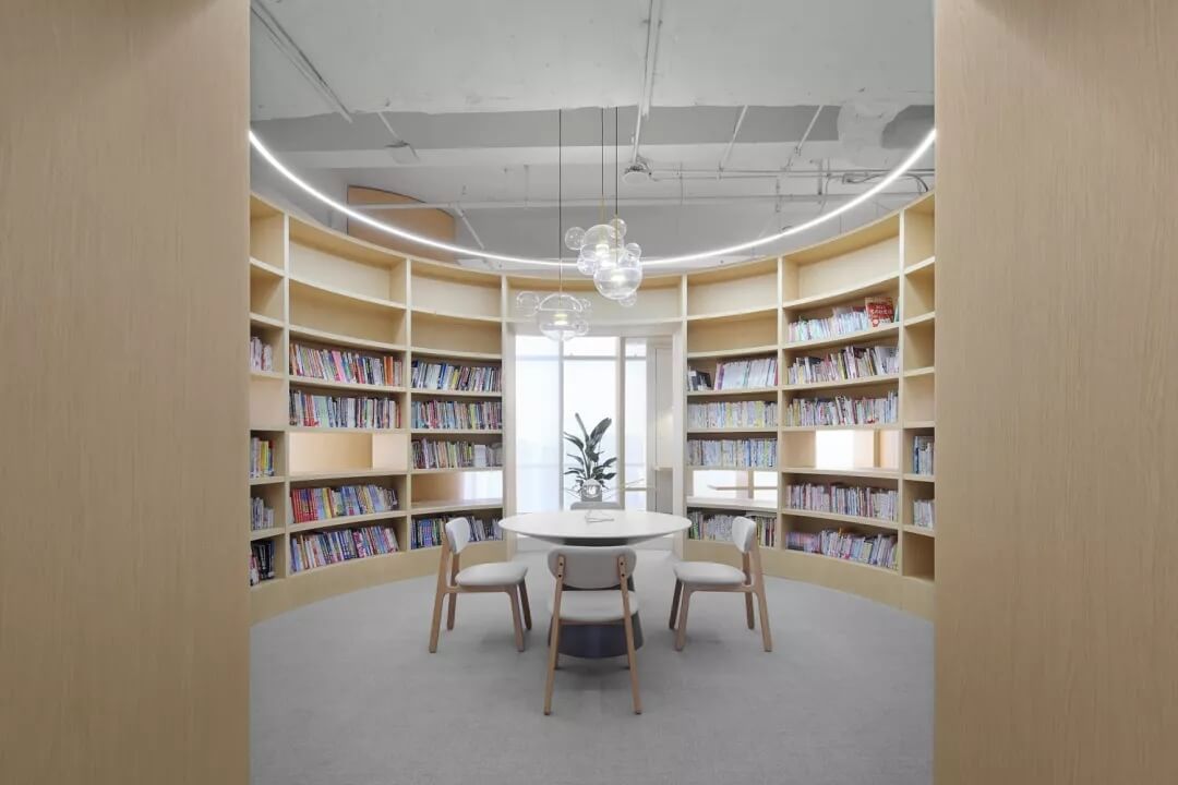 空間的劃分當(dāng)中,“圓形”起到了至關(guān)重要的作用,包括培訓(xùn)室和圖書閱覽室的設(shè)計(jì),運(yùn)用圓形圓潤的特質(zhì),柔和的將空間劃分,從而使空間的運(yùn)用上富有彈性,動線的流通更加靈活。位于西北角的圖書閱覽室,是整個室內(nèi)空間體量最大的一部分,同時(shí)也是此次設(shè)計(jì)亮點(diǎn)之一,它可放大約3000本書籍。