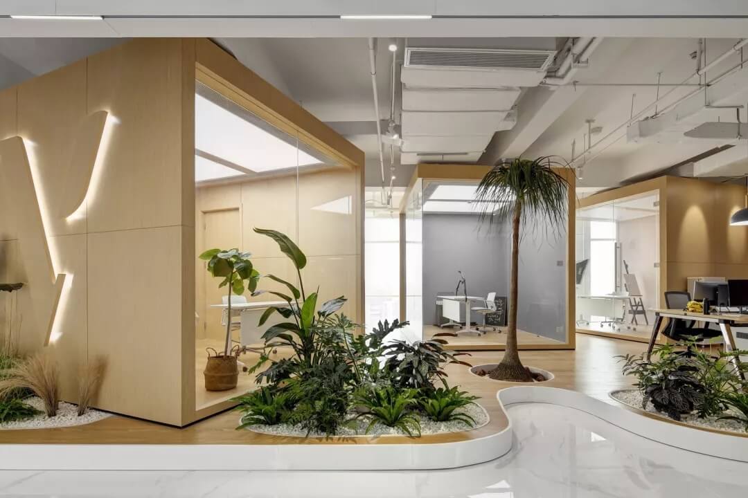 門廳接待處背景墻設(shè)計(jì)采用真實(shí)植物進(jìn)行裝飾,構(gòu)成生態(tài)的室內(nèi)空間,提升空間使用的舒適度。前臺的設(shè)計(jì)運(yùn)用體塊切割的方式做成不規(guī)則的形狀,以到達(dá)從不同的角度觀看到的場景都處于變化的狀態(tài)當(dāng)中。