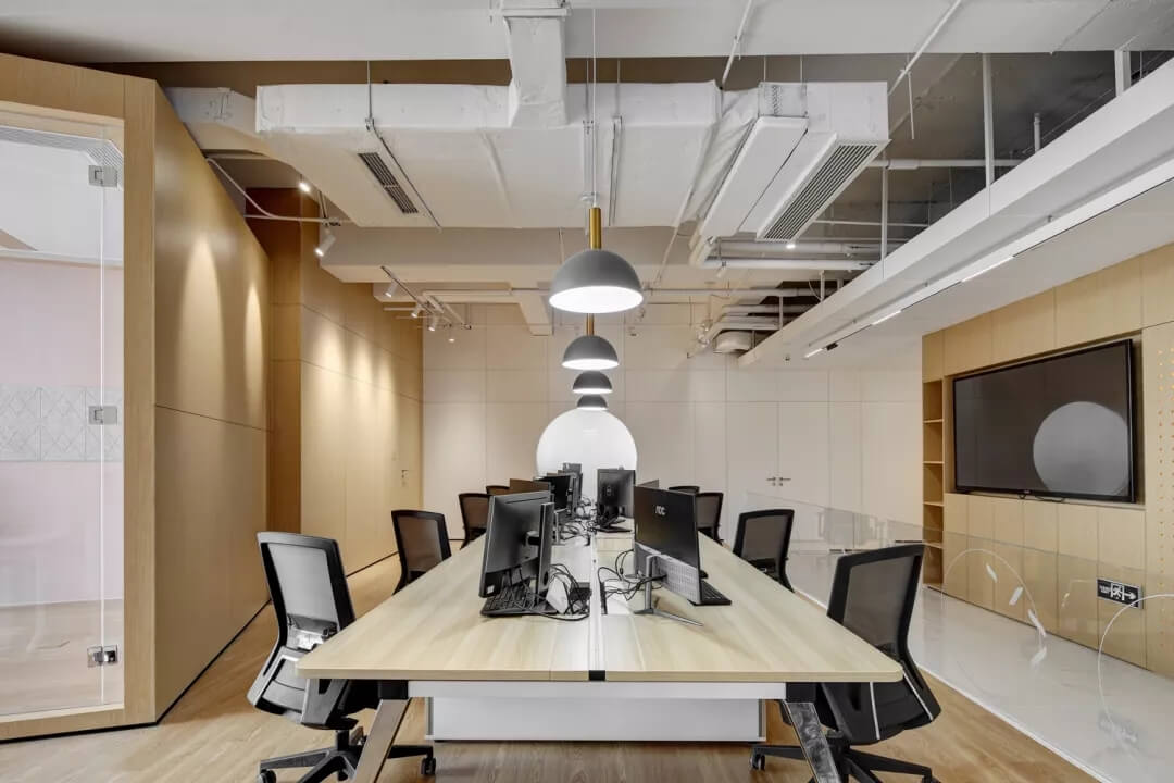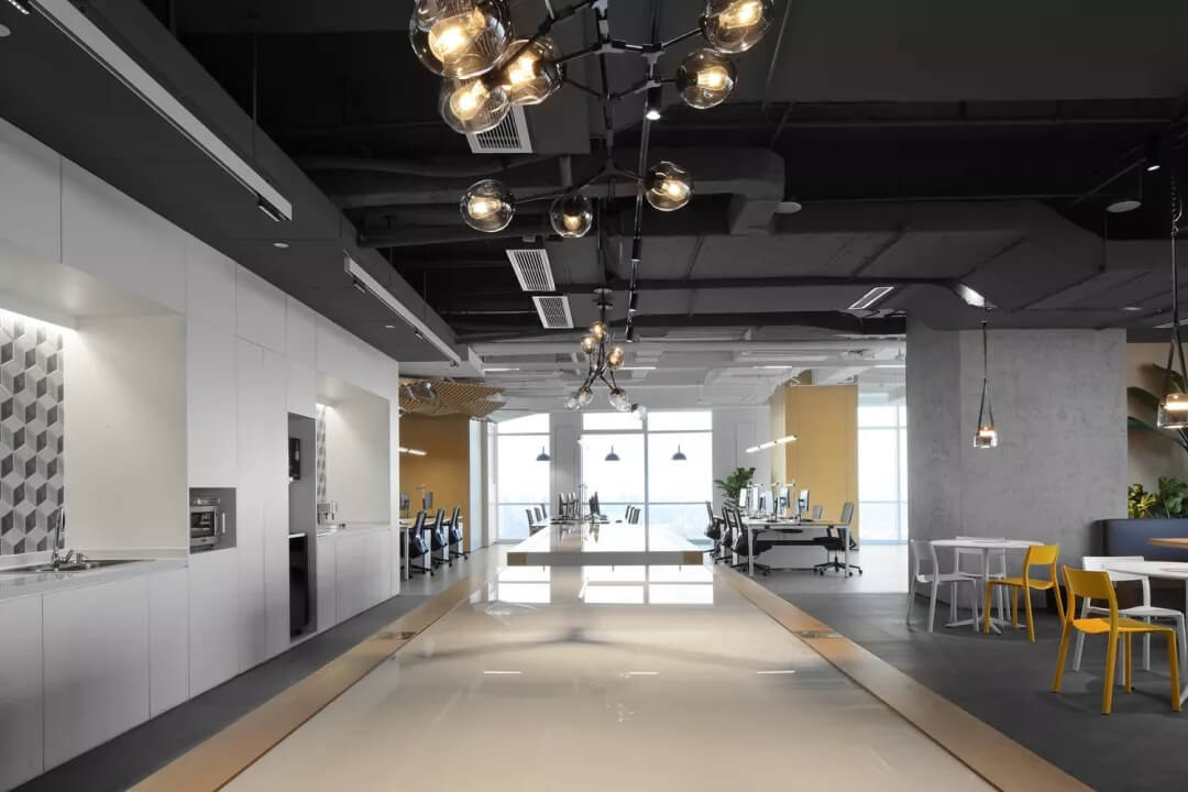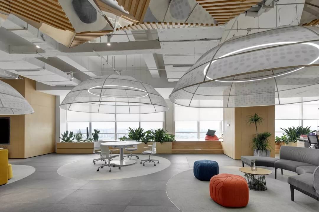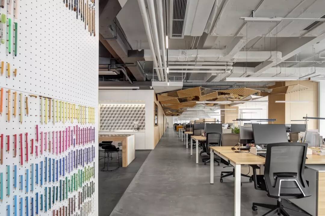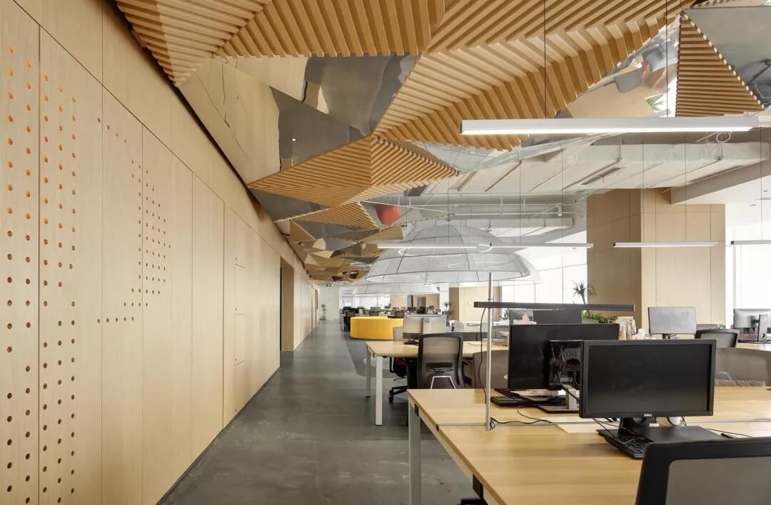 穿越員工休息區(qū),就到達(dá)了辦公室的員工工作區(qū),這里采用局部吊頂?shù)脑O(shè)計(jì),由三角形元素組合而成的“鉆石吊頂”劃分了空間頂部構(gòu)成,挑戰(zhàn)了使用者的視覺體驗(yàn),不僅豐富了辦公區(qū)域的層次,同時(shí)也增加了空間的趣味性。