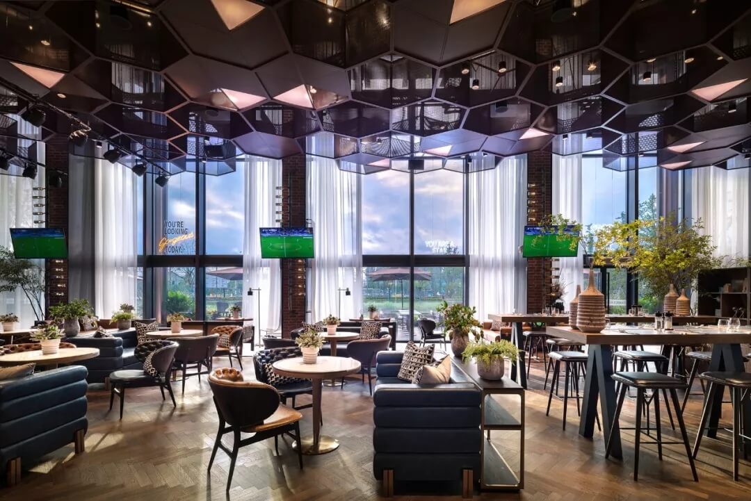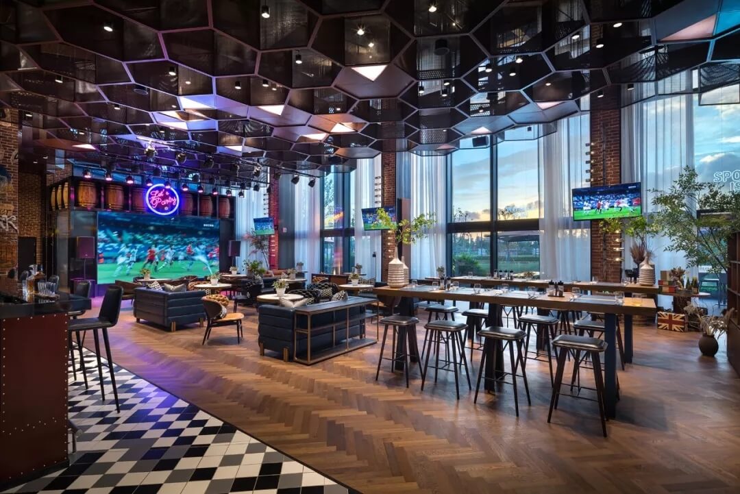設(shè)計將足球的六邊形化用于天花的裝飾上,立體幾何的體量、金屬線條的質(zhì)感賦予了社交空間的適當距離感。多幅大屏幕的配置,讓聚于此的人們,沉浸于啤酒吧和比賽現(xiàn)場的氛圍當中,盡情享受在開闊大氣的空間格局中觀摩賽事的自由,為熱愛喝彩,為夢想干杯,傳遞運動不止的精神。