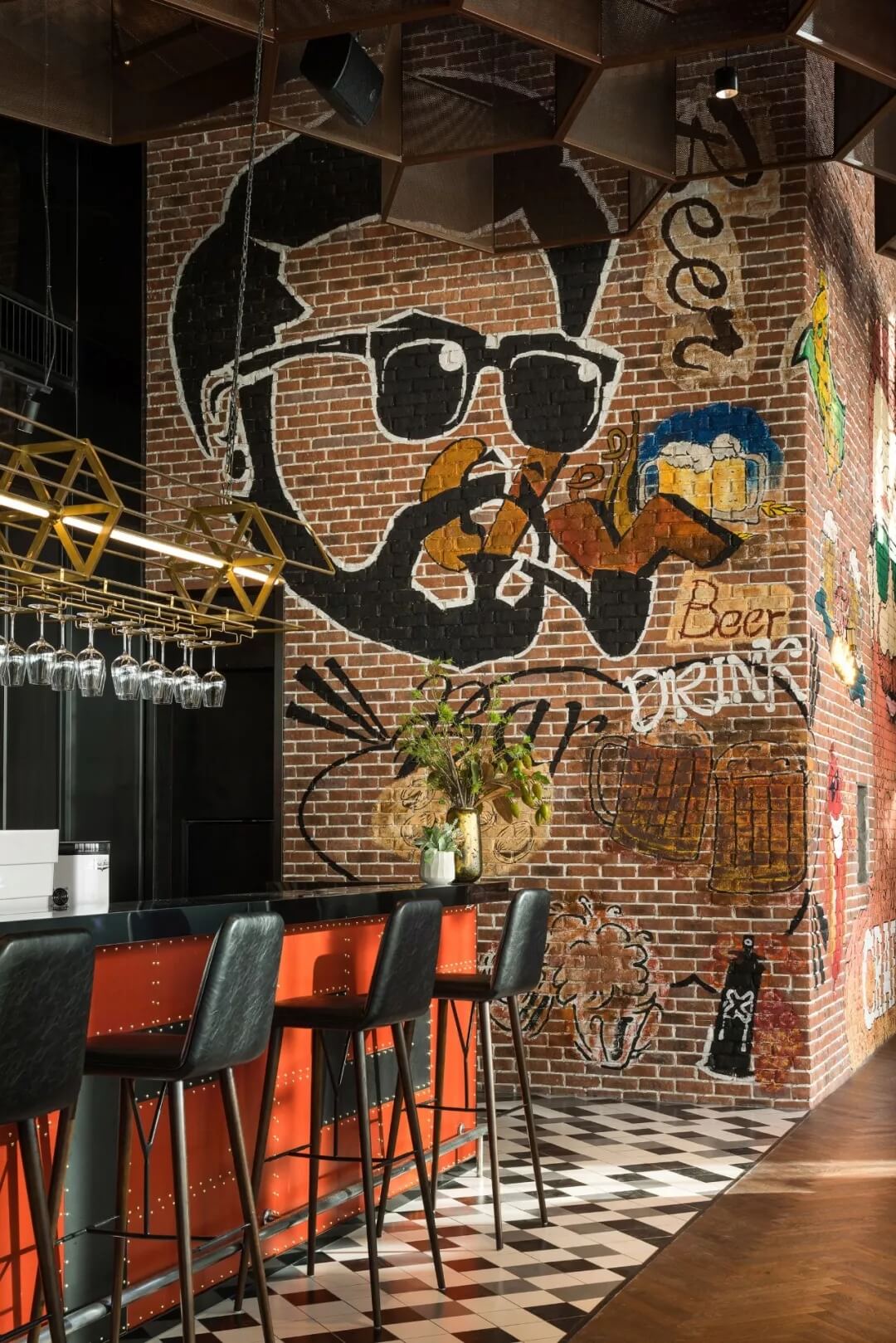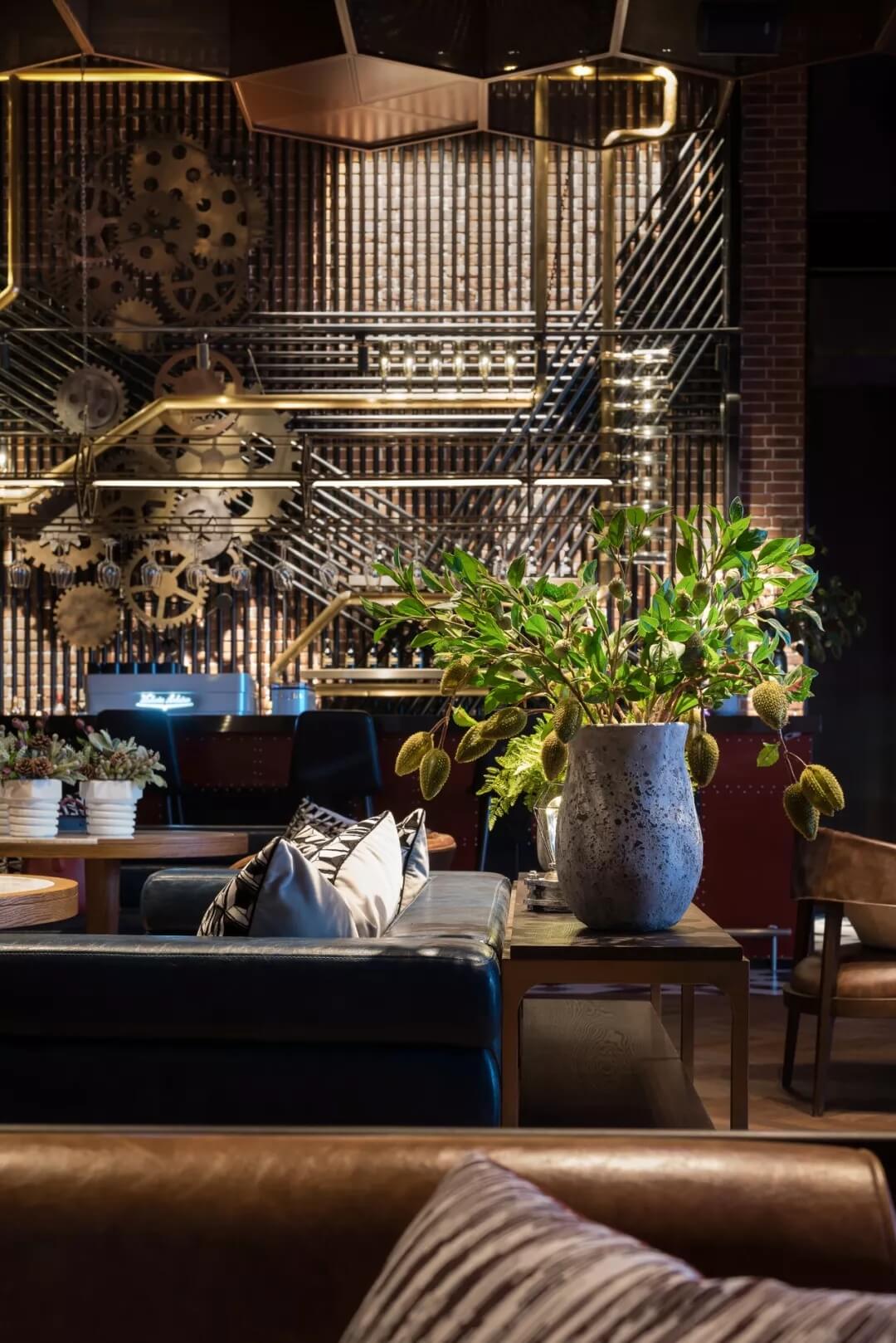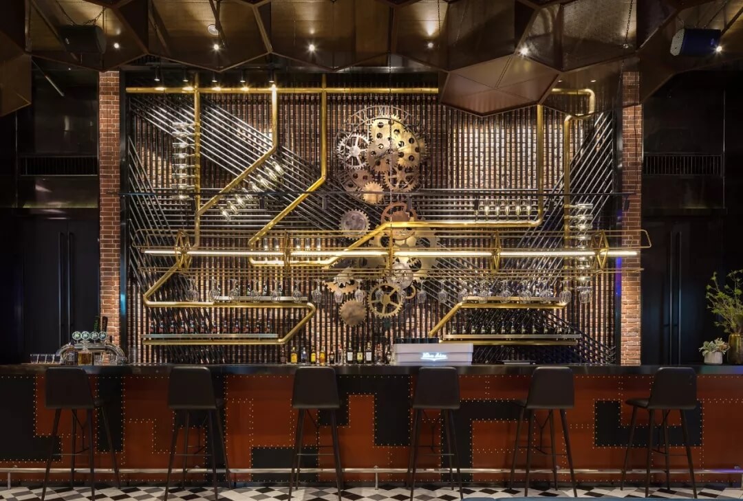 工業(yè)風的精髓在于,在原空間樸拙素簡的本真狀態(tài)下延展其自由隨性的氣質(zhì),在粗獷的空間架構(gòu)中消解拘束感,呈現(xiàn)出大氣又不失細膩的美感。粗礪的紅磚墻、朋克夸張的墻畫涂鴉、裸露的管道線路、復古做舊的齒輪掛件、紅黑交接的鉚釘吧臺......統(tǒng)攝進工業(yè)風的設(shè)計常規(guī)之中。