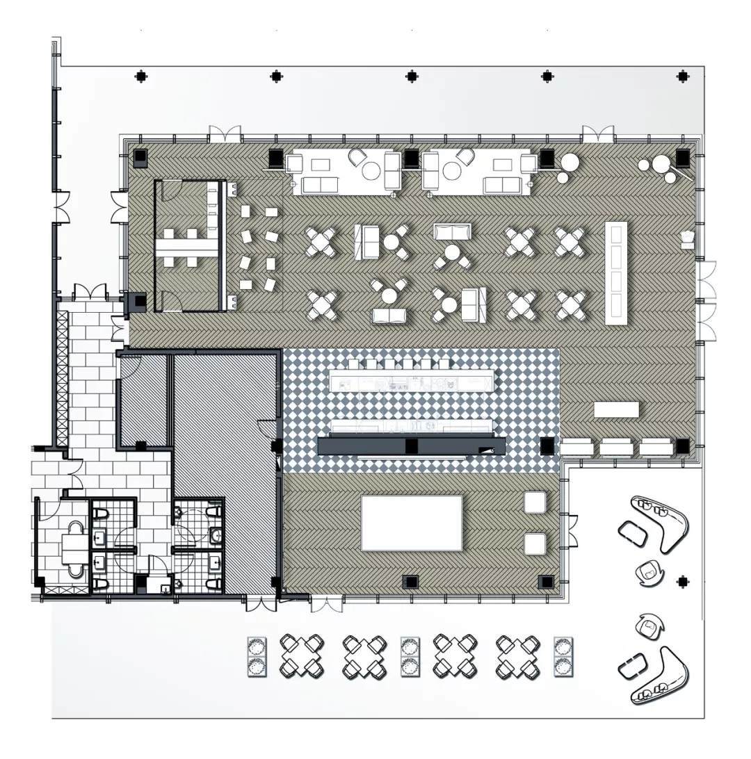 空間中所有符號語言均是設(shè)計的表象表達,與其深邃豐富的內(nèi)在視像緊密相連。未經(jīng)修飾的混凝土、鋼材料與金屬組件透露出粗獷與質(zhì)樸的氣質(zhì),長條燈飾融進鐵藝管道的線條穿插中,以光影效果加強幾何美學里的明暗層次,在硬朗中體現(xiàn)熱情與溫暖,點染酒吧一隅的休閑氛圍。