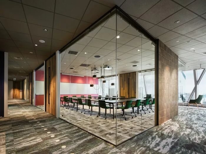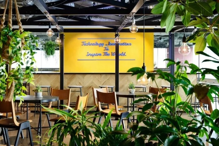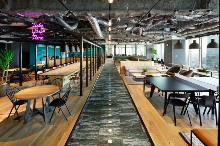 為此,設(shè)計團隊的目標是讓辦公室成為一個人們隨便可以咨詢房地產(chǎn)相關(guān)資訊的地方。入口處有許多綠植,寬敞的空間看起來比起居室還要舒服。辦公室配備了帶有防污圖案的框架,復(fù)古吊燈和帶有當下流行風格的霓虹燈標注,徹底改變房地產(chǎn)公司的傳統(tǒng)形象??臻g約有3300平方米,擁有20多件會議室,員工使用的公共空間介于工程師和代理商空曠的工作間之間。