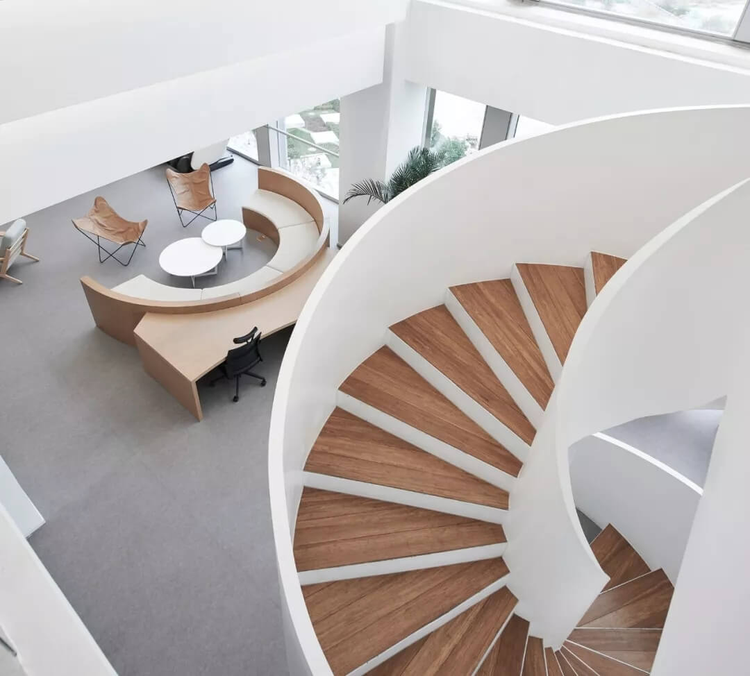 游廊藝谷島,設(shè)計(jì)師用鋼網(wǎng)構(gòu)筑出具有雕塑藝術(shù)感的包裹樓梯空間,通透性的白色鋼網(wǎng),簡(jiǎn)單時(shí)尚,加強(qiáng)與空間的融合。