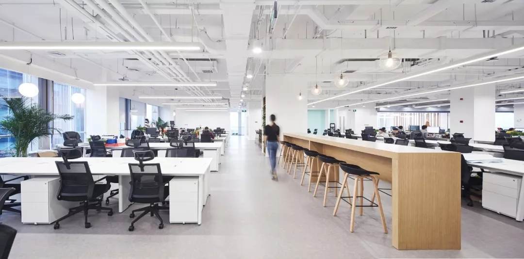 設(shè)計(jì)師在開放式的辦公區(qū)域設(shè)置長(zhǎng)條吧臺(tái)桌,供員工自由討論辦公,午間用餐等,同時(shí)開放辦公區(qū)與南側(cè)公共島空間相連,員工可攜帶筆記本在這里沐浴著陽(yáng)光辦公,討論,商務(wù)洽談,休憩等。