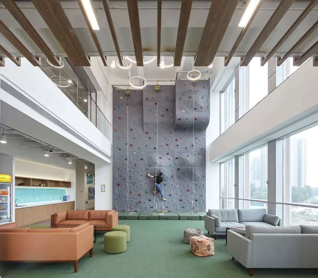 綠籬奇跡島,是自然,健康運(yùn)動(dòng),挑戰(zhàn)自我的主題公共空間。木質(zhì)格柵樓梯在二層延伸出一個(gè)通透的格柵BOX,形成豐富的空間層次和視覺高差。同時(shí)設(shè)置攀巖墻,瑜伽室和健身房,展現(xiàn)新氧人不懼挑戰(zhàn),運(yùn)動(dòng)健康的生活方式。