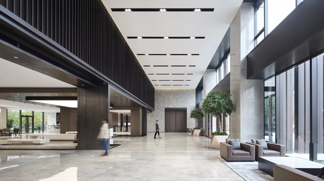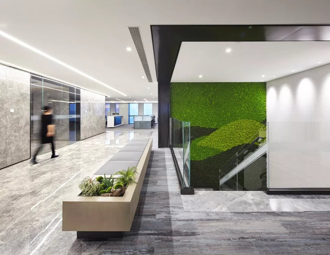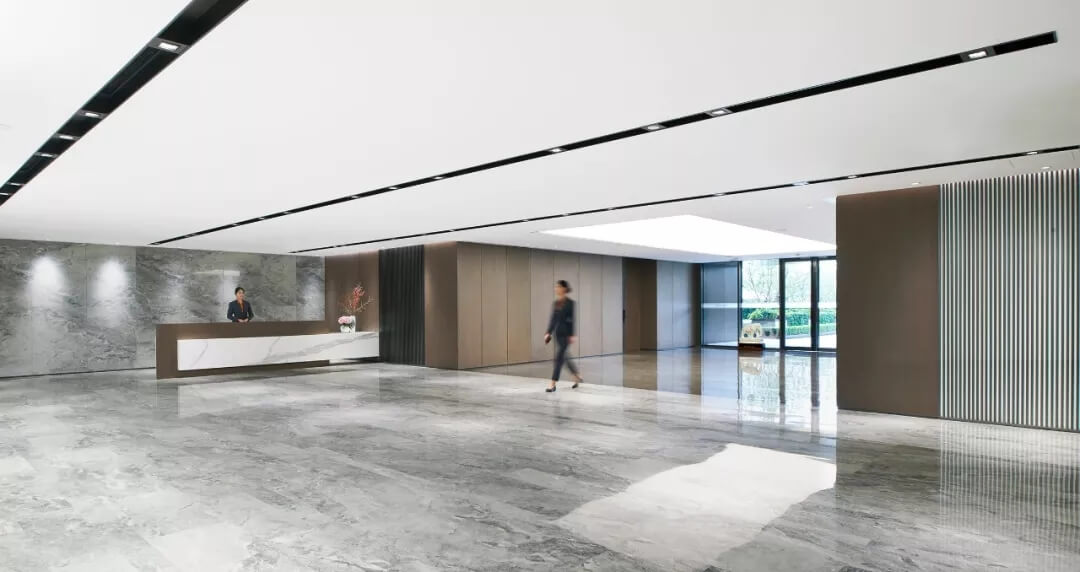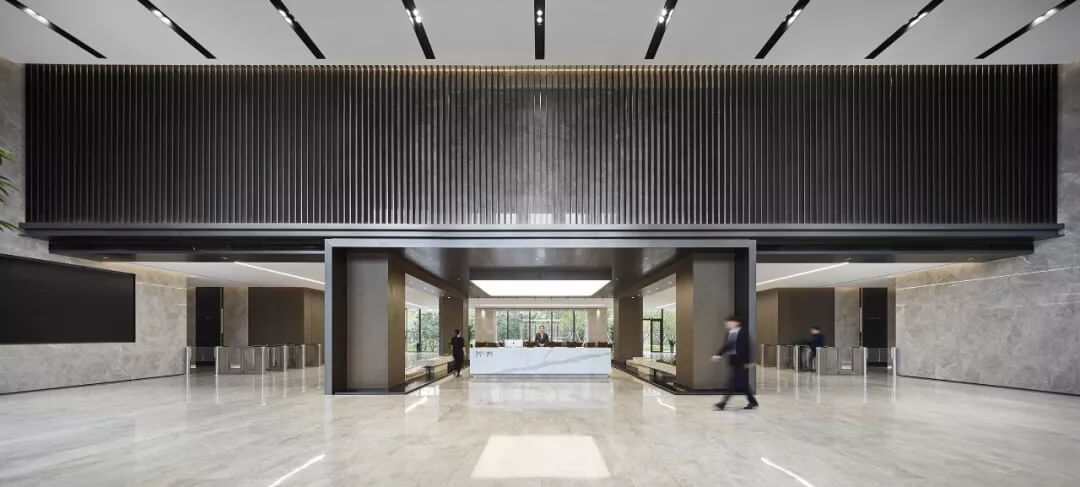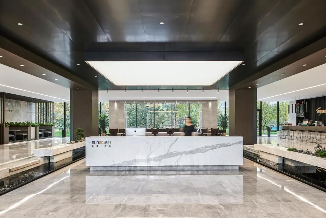 大堂是開放,通透,自然的園林式空間,自成一片天地。踏入大堂即可看到前廳接待島,方形四面通透的造型,嚴(yán)謹(jǐn)不失靈活,結(jié)合流動水景和盆景,營造了生態(tài)的,四季怡情的綠色辦公。電梯廳出入口在接待島兩側(cè),實現(xiàn)快速集散,避免上下班高峰期等候擁堵??Х鹊群騾^(qū)玻璃窗形成框景,把室外花園內(nèi)的四季變幻,自然元素都納入到室內(nèi)來,形成情景共融。