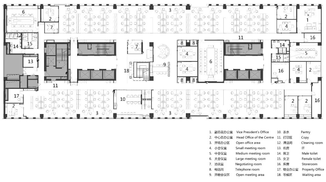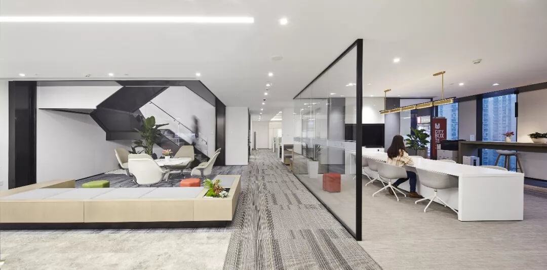 在空間規(guī)劃和功能布局上,兩側(cè)光線條件良好的區(qū)域設(shè)置開敞辦公區(qū);核心筒區(qū)增設(shè)存儲空間、電話間,洽談空間,會議室,滿足各種洽談會議需求;電梯集散口設(shè)置樓梯吹拔等候區(qū)、茶水區(qū)、景觀小品等開放共享和展示空間;采光較弱的中間區(qū)域,插入玻璃盒子做會議室。整個平面布局,在原建筑條件基礎(chǔ)上,融合融創(chuàng)需求,級級遞進(jìn),相互銜接。