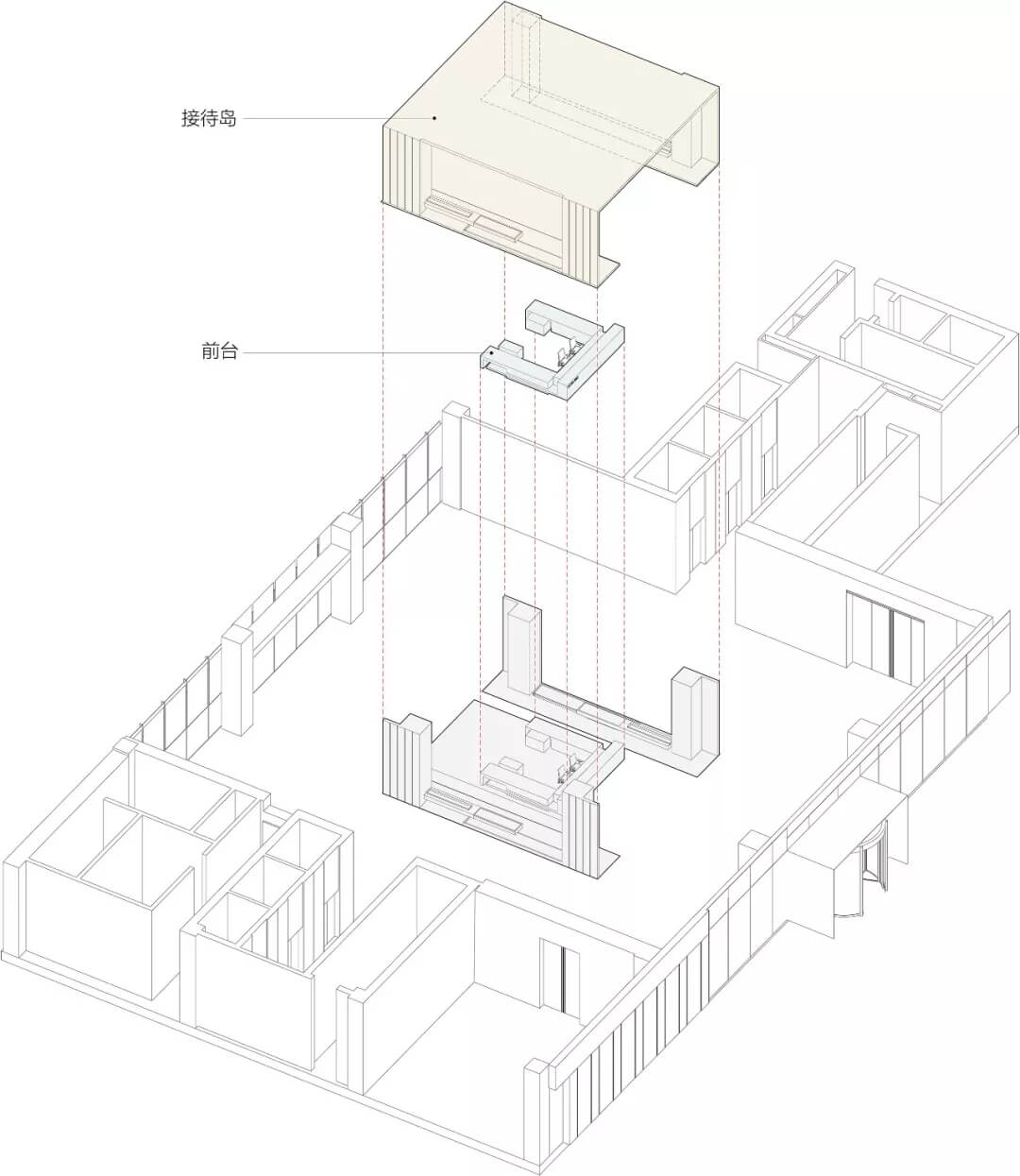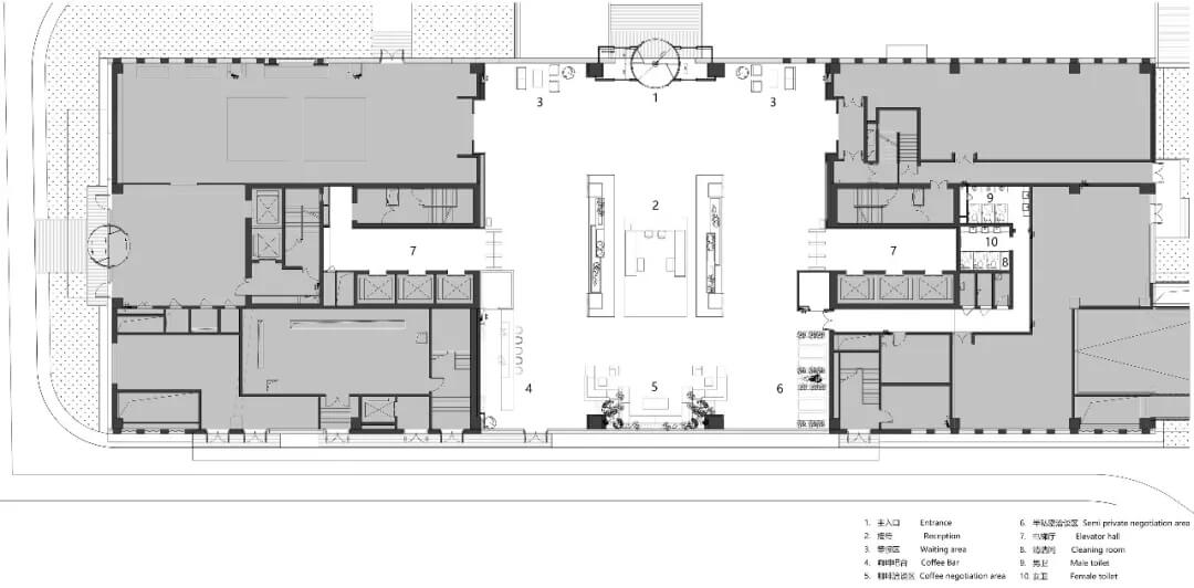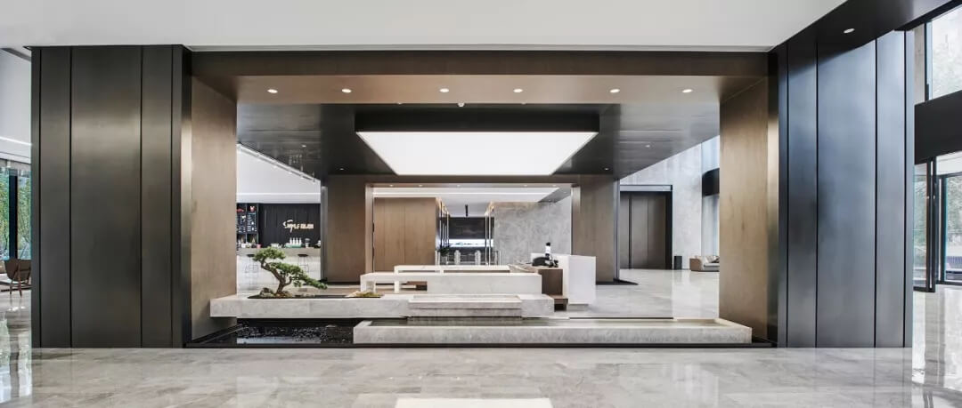 設(shè)計師通過空間布局,材料選用等營造出大堂沉靜務(wù)實、理性的空間氛圍,咖啡,水聲,盆景,窗外的花園,以及往來的員工,客戶和行人賦予這里靈魂和氣息,使整個大堂充滿各種可能性。