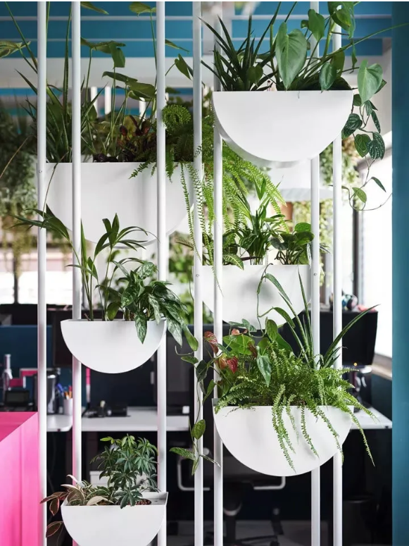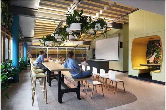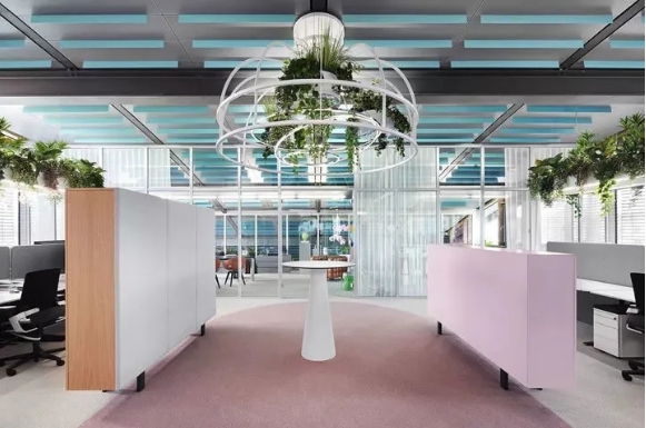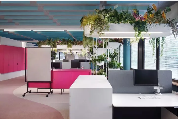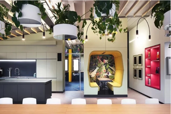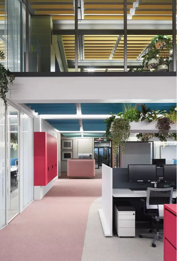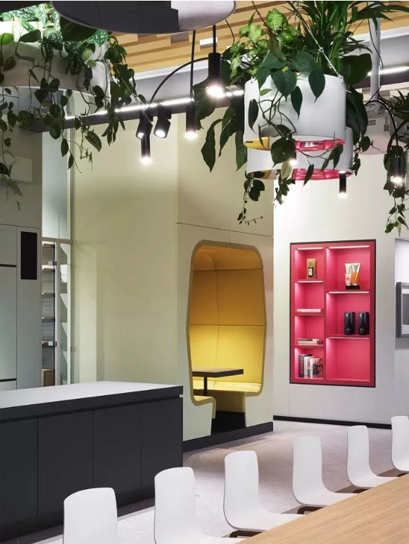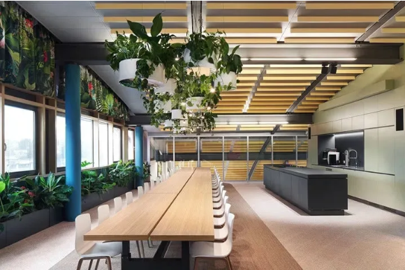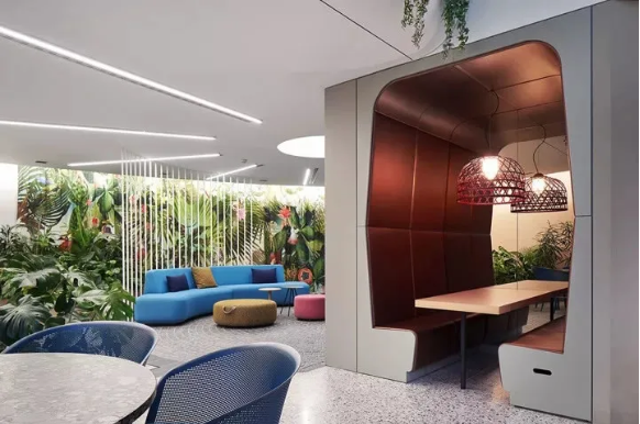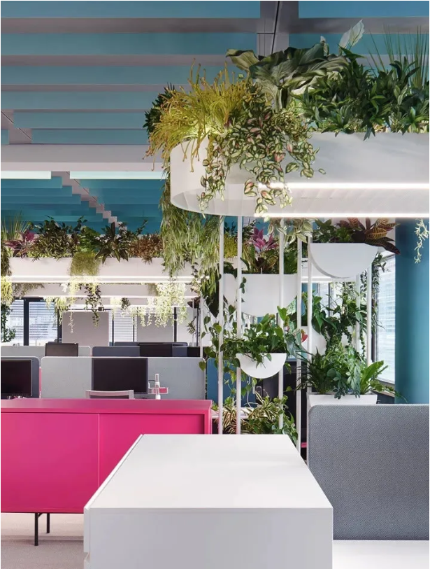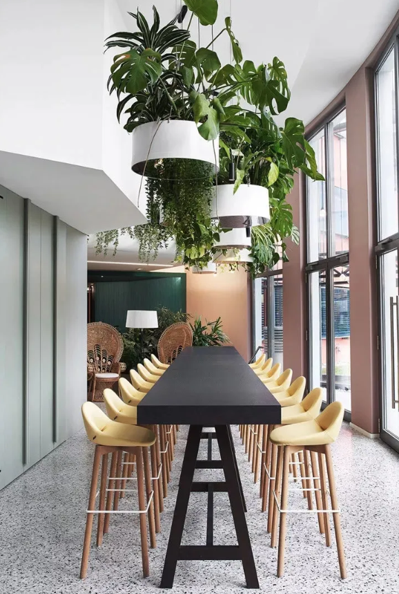 首先,設(shè)計(jì)團(tuán)隊(duì)為這處工作場所增添了2100個(gè)超級盆栽植物。綠植能產(chǎn)生良好的情緒、降低精神壓力、促進(jìn)創(chuàng)新、提高績效。此外,綠植還能改善空氣質(zhì)量、營造健康環(huán)境,并起到降噪的作用。它們只需定期澆水就能保持茂盛狀態(tài),因此深得人心。室內(nèi)盆栽植物具有強(qiáng)大的正能量。自從加入了這些綠化,室內(nèi)濕度不僅從18%增加到44%,讓人們的體感非常舒適,連員工的病假都減少了一半!