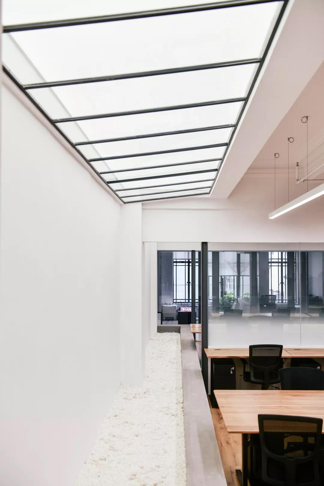 總共三層的空間由于老建筑既有格局的影響,采光較差,我們?cè)谟邢薜拿娣e中挖出一個(gè)中庭,同時(shí)利用原有的破損樓板創(chuàng)造了若干“天窗”,巧妙地使用照明來(lái)創(chuàng)造光亮,消解歷史建筑本身的體量和沉重感。因此,從略顯晦暗、滄桑的歷史建筑走進(jìn)辦公空間是一種如釋重負(fù)的輕快和光明。