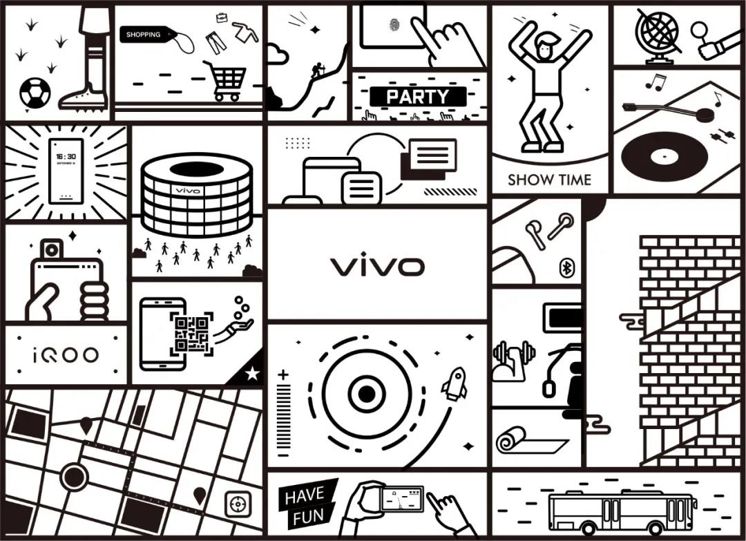 咖啡廳翻轉(zhuǎn)板設(shè)計的插畫,由vivo手機(jī)不同的使用場景組成,傳達(dá)品牌精神。