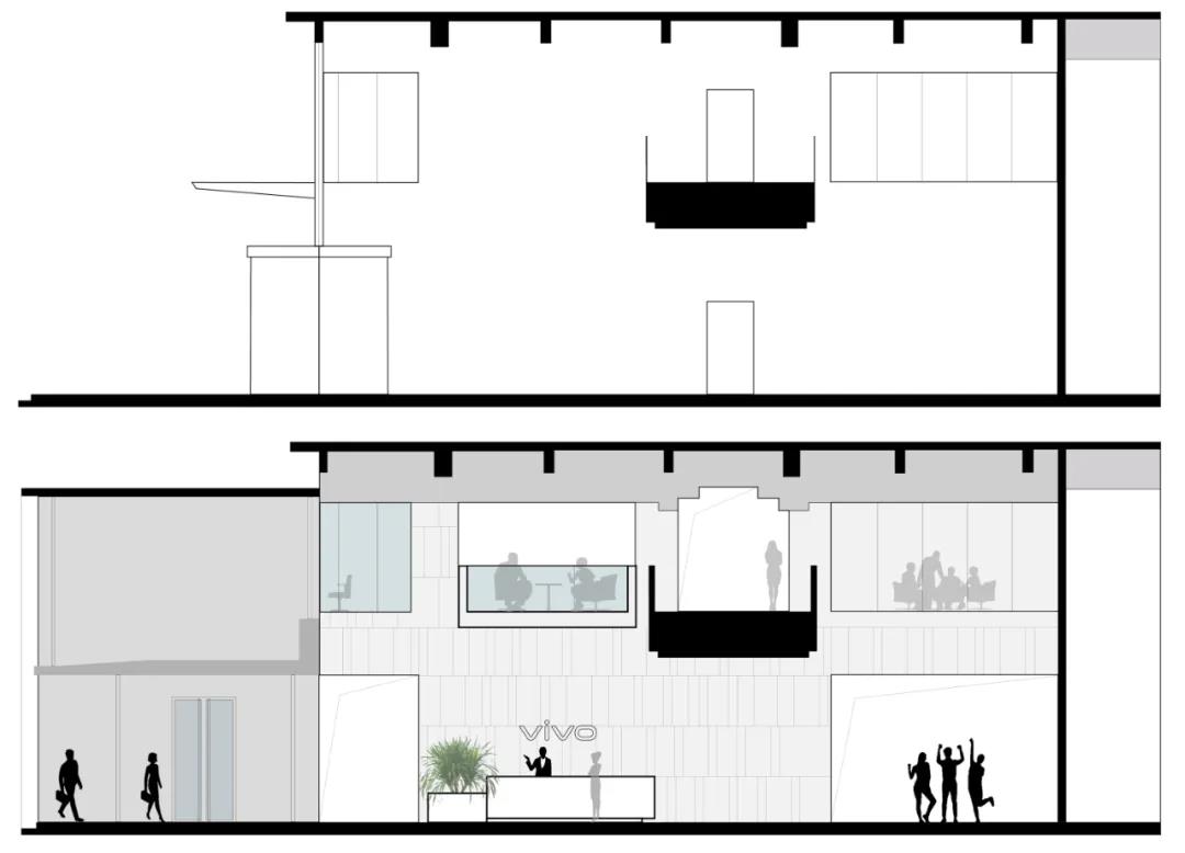 大堂作為整體的對外開放和形象展示空間,配備了咖啡,休閑茶水,展廳,洽談,會議等開放的功能性空間,配以圖像視覺傳達(dá)設(shè)計,軟植入vivo品牌精神。