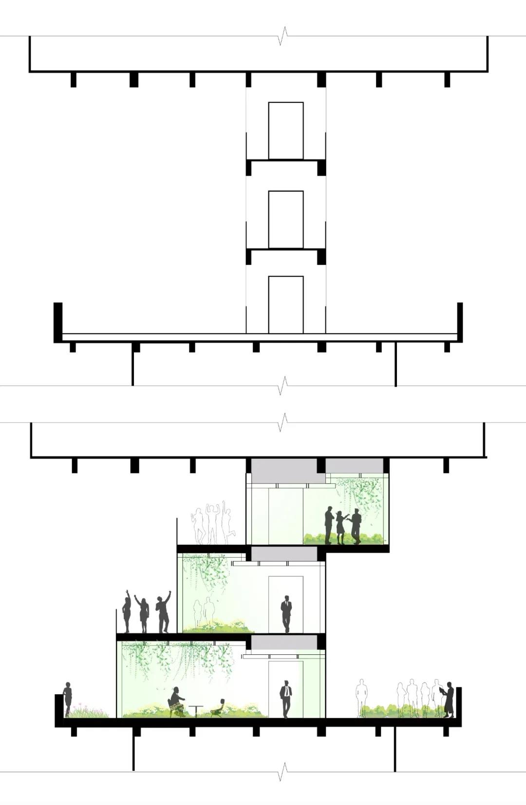 在建筑中段的4-6層,是一處半室外的連橋空間。通過結(jié)構(gòu)適度改造營建了三個疊落的空中花房,同時每個花房都配有戶外露臺作為空間延展。矩陣型木質(zhì)天花延伸到側(cè)墻并落地,地面鋪防腐木條,整個空間配備綠植,營造輕松、生態(tài)的戶內(nèi)外休憩空間,同時還可作為研討,舉辦小型活動的多功能空間使用。