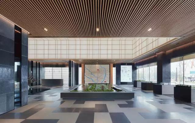 步入大廳,通過(guò)“借景”手法,將頗具詩(shī)情畫意的東方園林之景鋪呈在眼前,一抹翠綠更是讓整個(gè)空間靈動(dòng)起來(lái),巧妙而又極具視覺(jué)沖擊。在陽(yáng)光照射下,投影又成為景觀的一部分,展示出自然與建筑的互動(dòng),活躍且適宜。一大排落地窗串聯(lián)起室內(nèi)外關(guān)系,正是光線的引入,讓建筑、景觀、室內(nèi)形成有序的一體。沿著預(yù)接待吧臺(tái)的動(dòng)線向前穿引,便是整個(gè)銷控區(qū)域。