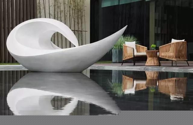 深灰色意大利火山石與柔和的沙發(fā)茶幾相得益彰,互為映襯。而光線照射進(jìn)來(lái)更是活躍了整個(gè)空間,落地窗外便是庭院。水景區(qū)域一只白天鵝正在梳理羽毛,而水畔一側(cè)的休息區(qū)域更是增添了一縷閑情逸致,營(yíng)造一種靜謐愜意的氛圍。