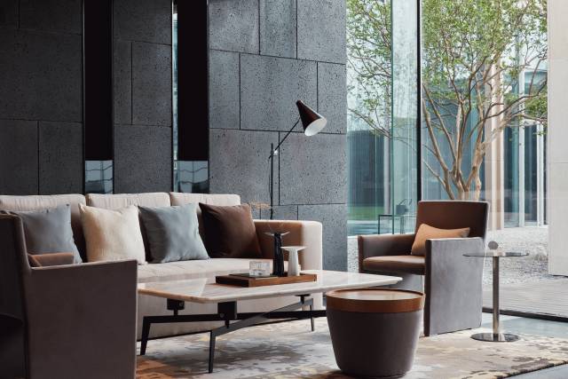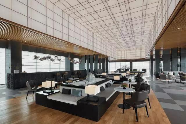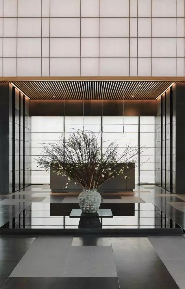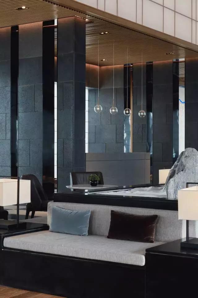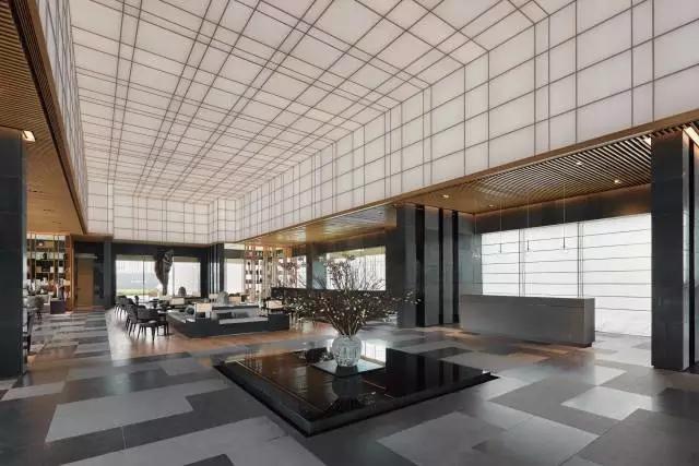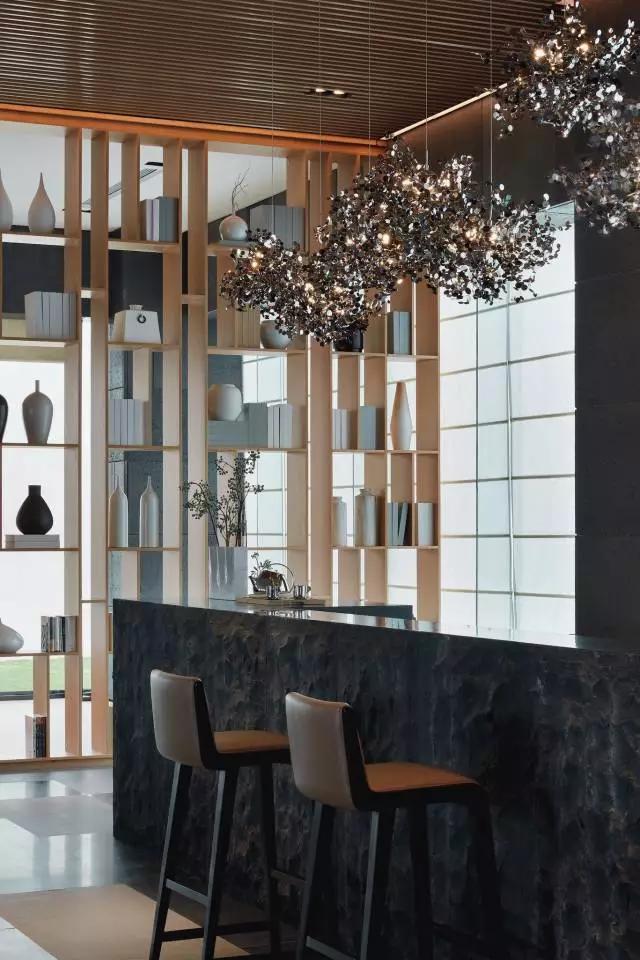 借由東方園林式的假山,打造出“未若柳絮因風(fēng)起”的雪景,美如水墨畫、細(xì)膩至極。這與圍繞式洽談方式布置相結(jié)合,巧妙處理好空間形態(tài)和陳設(shè)之間的關(guān)系。大尺度挑高設(shè)計(jì),加上頂部有序交互的線條,讓空間極具延展性,通透敞亮的照明效果搭配藝術(shù)性燈光點(diǎn)綴,使整體氛圍更顯大氣與品位。該空間通過(guò)主體、功能位置、通透的序列式的立面關(guān)系,自然分割空間視線,同時(shí)又實(shí)現(xiàn)了將光線引入到室內(nèi)的最大化。