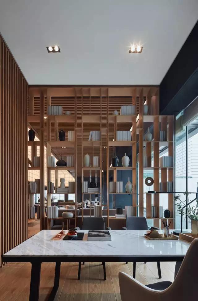 VIP區(qū)域原木色書架、豎向的木百葉有效阻隔區(qū)分空間,與周圍關(guān)系相互連接又互不打擾,形成半開放式的私密空間,整體保證了空間的互動(dòng)性與獨(dú)立性。在這個(gè)“書卷留白筆墨濃”的區(qū)域,營(yíng)造出靜心一隅,構(gòu)筑具有人文氣息和品質(zhì)感的氛圍。