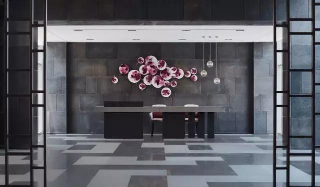 預(yù)接待吧臺(tái)與大廳講究整體的對(duì)稱平衡,通過(guò)巧妙的吧臺(tái)構(gòu)成形式、空間吊燈的位置,呈現(xiàn)靈動(dòng)的立面關(guān)系,有效緩解空間的呆板。大面積深灰色石材,配以紫色壁飾花瓣式鋪灑開來(lái),夾雜一絲神秘感,東方韻味無(wú)限彌散。