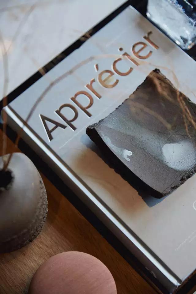 水吧臺(tái)以毛鑿面的形式呈現(xiàn),質(zhì)樸卻別具一格。而光線透射在吧臺(tái)頂面,又與書架、吊燈以及頂部的木百葉形成互動(dòng),勾勒出繽紛的空間輪廓。粗獷肌理感的石材,又與花瓣式的吊燈形成材質(zhì)上的鮮明對(duì)比,晶瑩璀璨。
