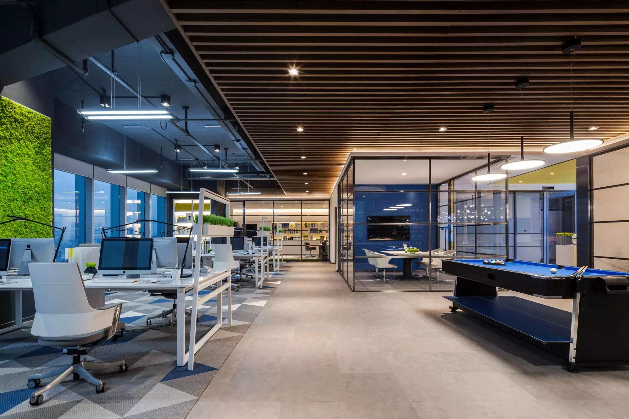 裸露的天花與木格柵的設(shè)計(jì),形成反差,重點(diǎn)突出了原建筑的空間感,與時(shí)下設(shè)計(jì)熱點(diǎn)相適應(yīng);臺(tái)球的細(xì)節(jié)設(shè)計(jì),體現(xiàn)了公司對(duì)員工精神層面上的關(guān)懷,工作之余,還可打一桿臺(tái)球放松身心。