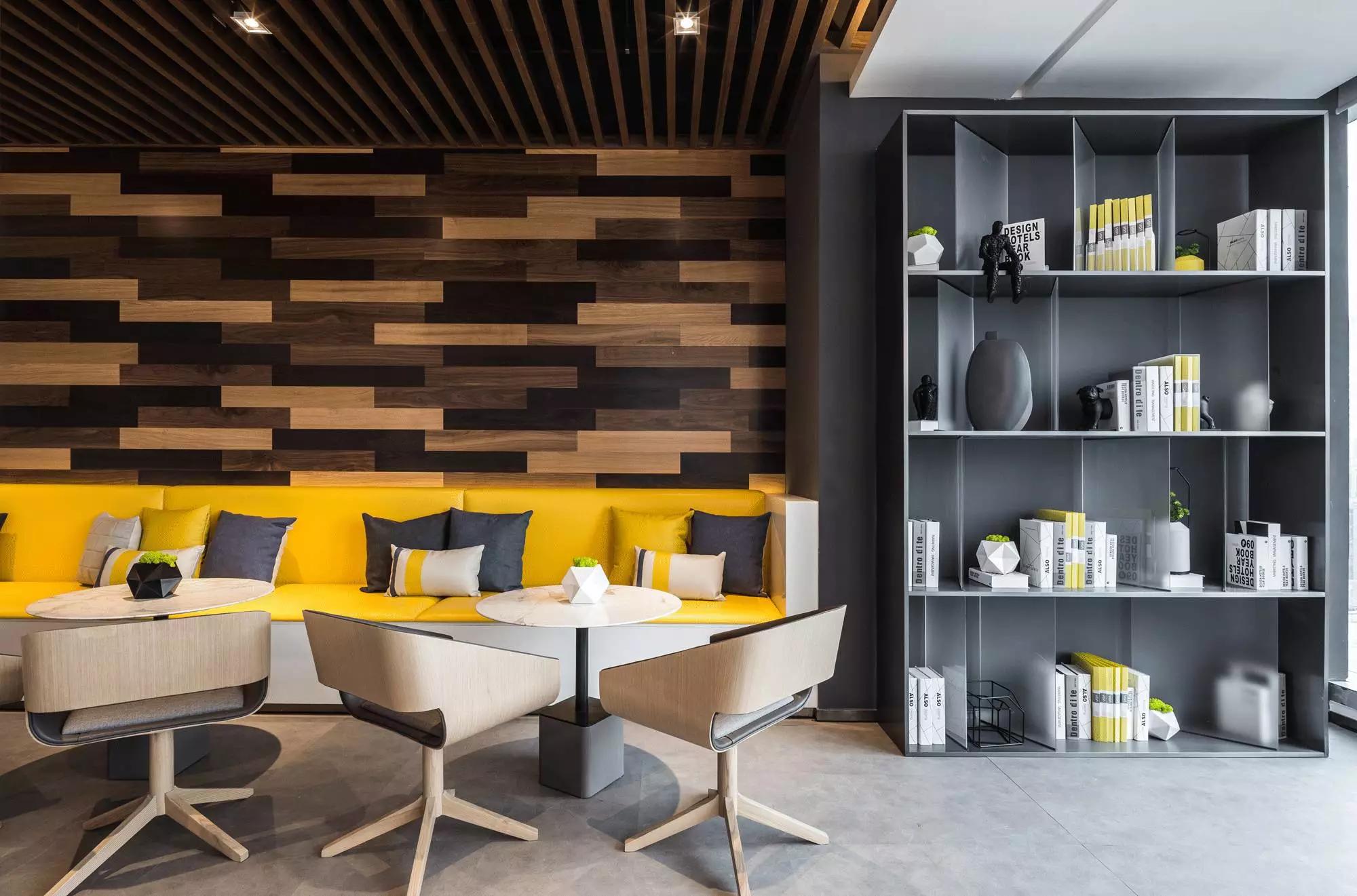 設(shè)計(jì)師用藍(lán)與灰搭配出冷靜主色調(diào),綴以沙發(fā)的暖意來(lái)提亮空間,而背景以深淺原木交錯(cuò)搭配,設(shè)計(jì)流于細(xì)節(jié)之中。閑時(shí),或仰臥在沙發(fā)上、在其旁邊的書柜看一會(huì)兒閑書,或坐在沙發(fā)上與同事聊聊天、聽一段舒緩的音樂(lè)、下一盤棋,小憩之后再投入工作,想必效率也會(huì)更高。