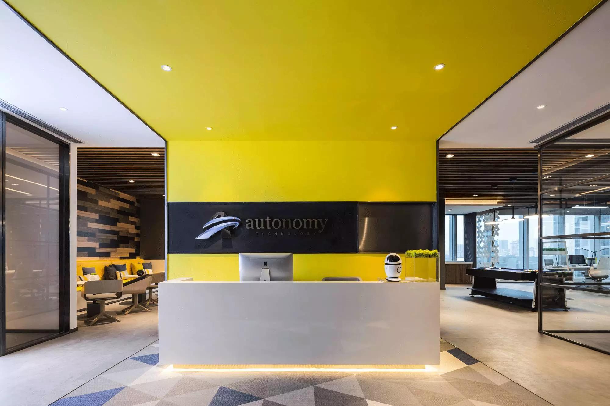 入口,一抹明亮的暖黃尤其奪目,且從背景墻開始延伸、直至天花,渲染了科技感,反差較大的色彩搭配給眼睛帶來(lái)強(qiáng)烈的視覺沖擊,一眼便能望見“autonomy”,點(diǎn)明主題。