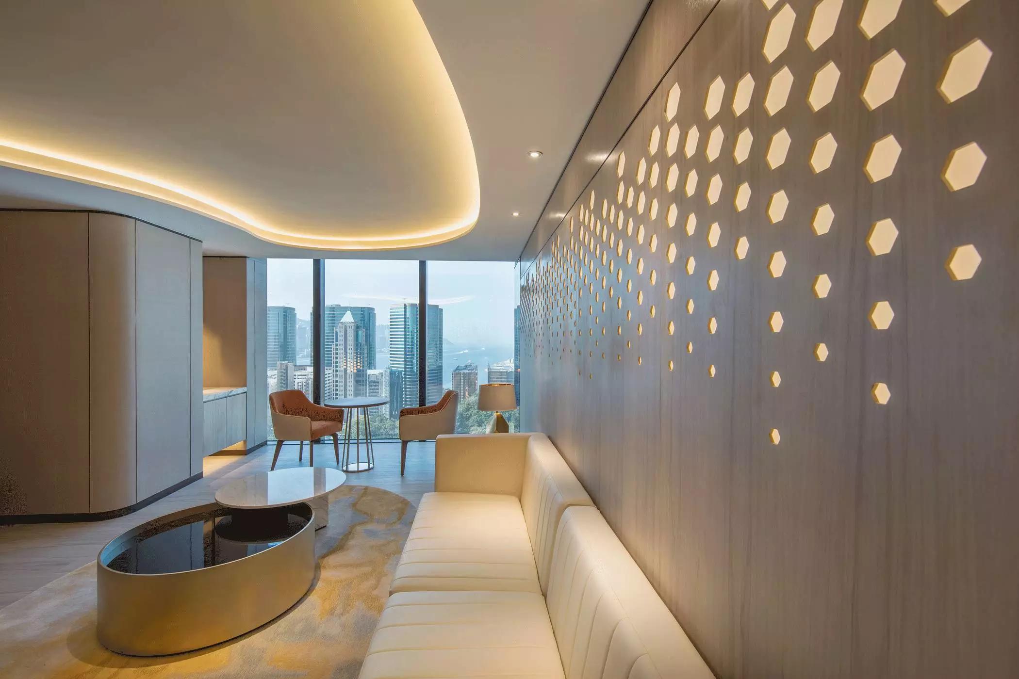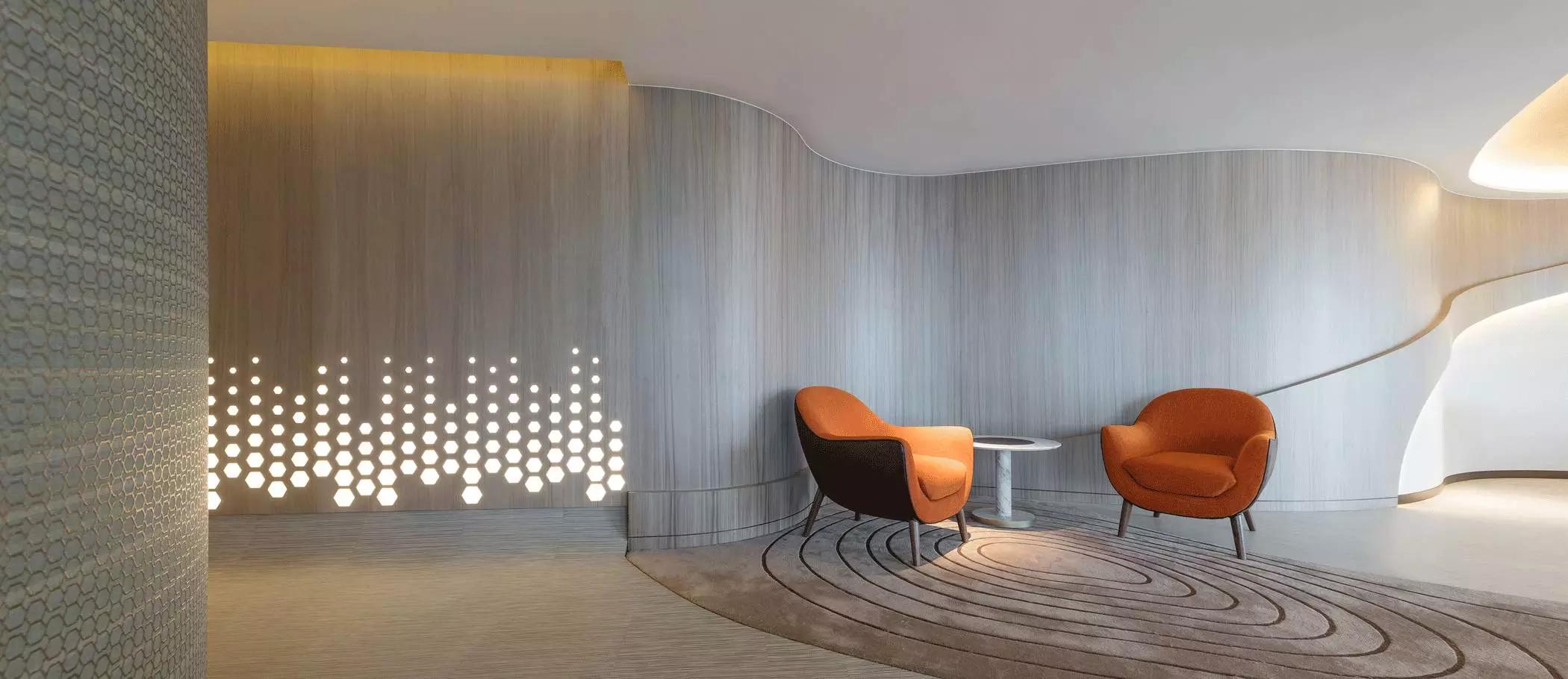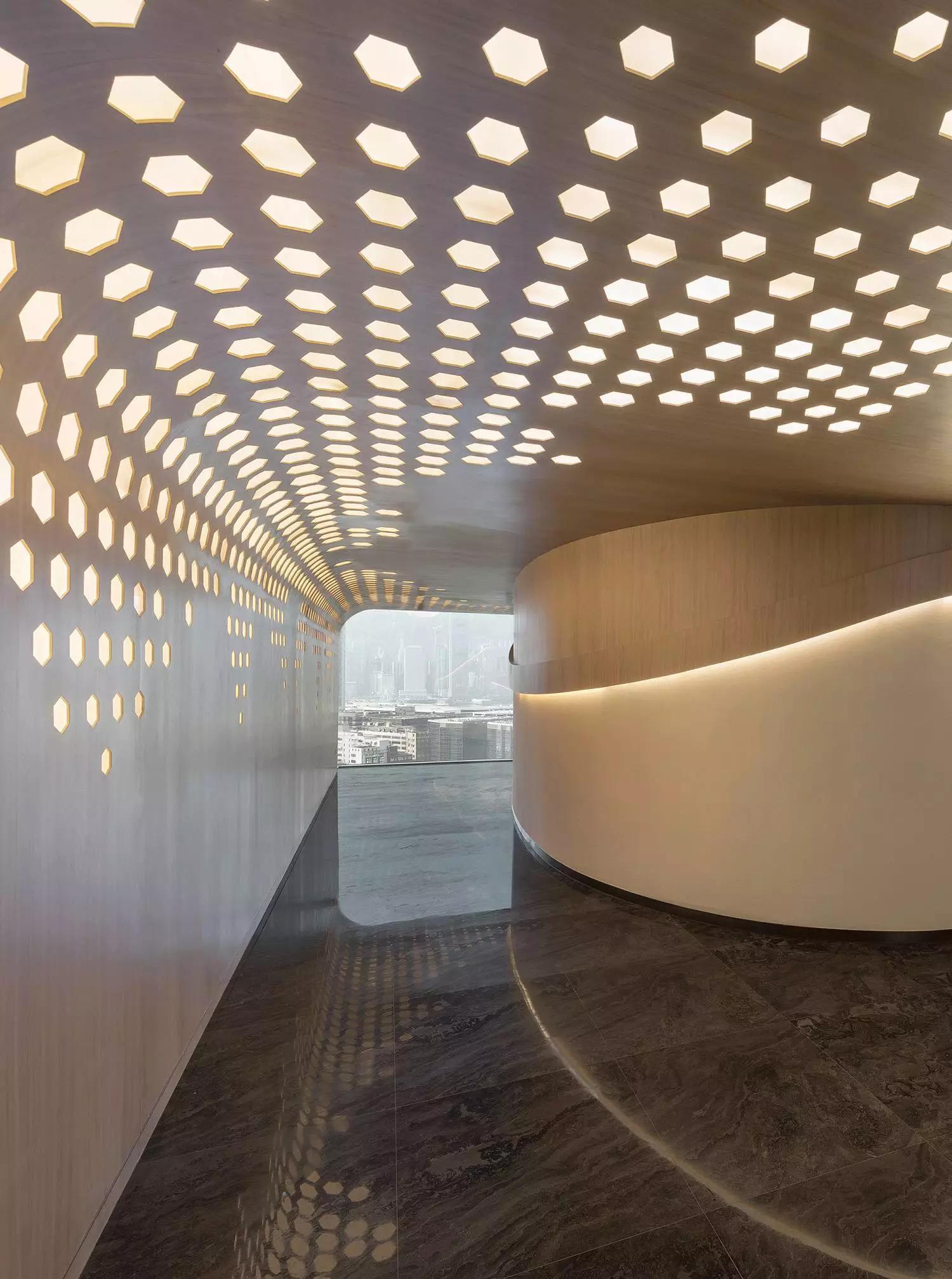 蜂窩形狀滲進天花至墻身的燈箱以及屏風(fēng),體現(xiàn)出大自然的親和力讓人心沈靜,宛若森林小徑,葉縫間穿過而灑落的陽光,體現(xiàn)日本韻文中的「Komorebi」靜謐而悠閑涵蘊希望。