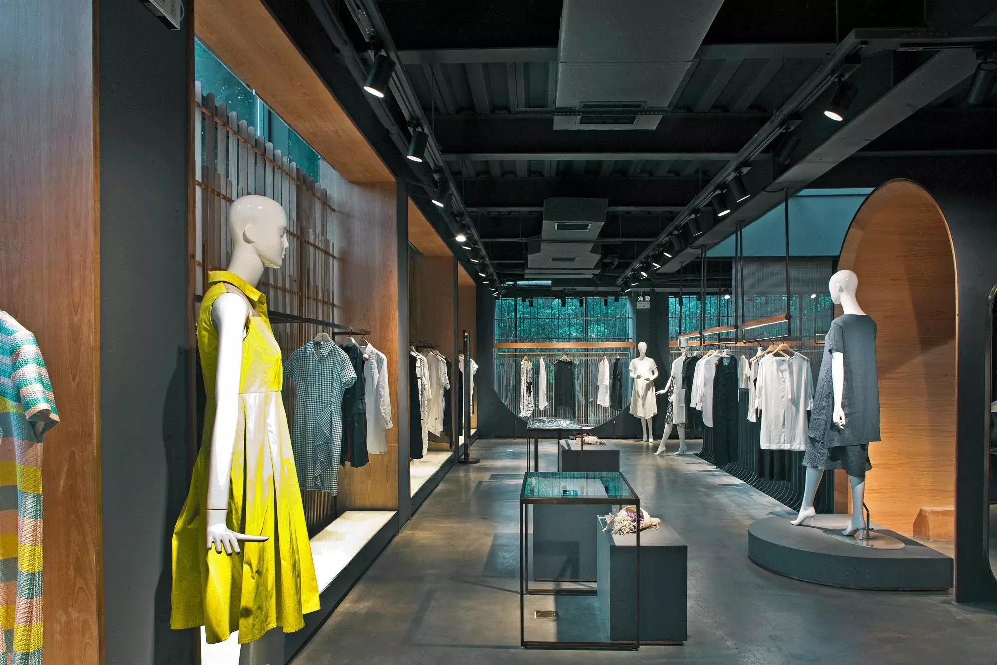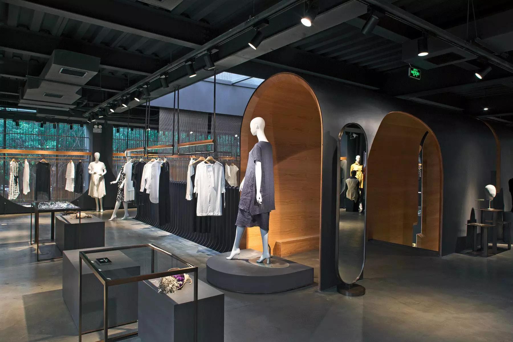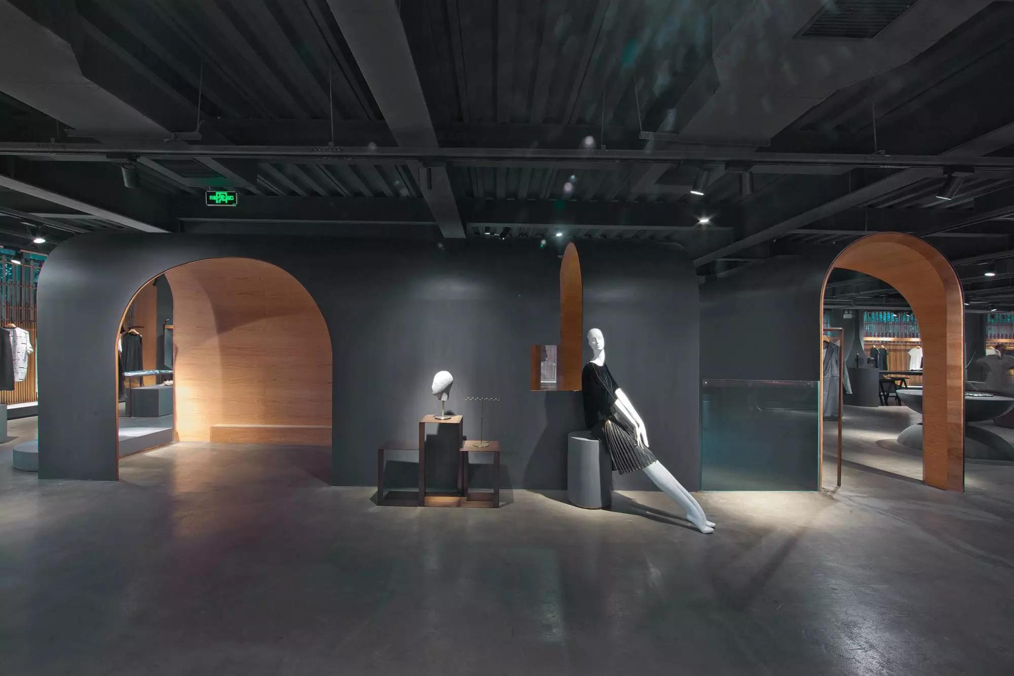 和一般常規(guī)服裝店陳列的概念不同,新的店鋪概念強調(diào)建筑化的零售模式。纖細的木屏風(fēng)結(jié)合貨架矗立在邊界處,渲染了空間和室內(nèi)飾面的豐富多樣性,建筑元素顯露材質(zhì)原始的質(zhì)感,烘托服裝的品質(zhì),這種手法為整個店鋪灌注純粹的氣氛,隱喻品牌的精神。天井樓梯釋放出不同光影效果,使整個空間與建筑取得一種時間與空間的對話。設(shè)計中,我們直白的將不同的“拱”垂直交疊,希望在垂直空間上制造不同的空間與體驗。這個特殊的表現(xiàn)方式給人們提供強烈的視覺效果。依據(jù)商業(yè)需求,采用模塊式設(shè)計,這樣可以使品牌不同功能具有最大的靈活性。